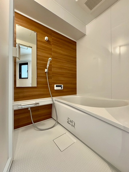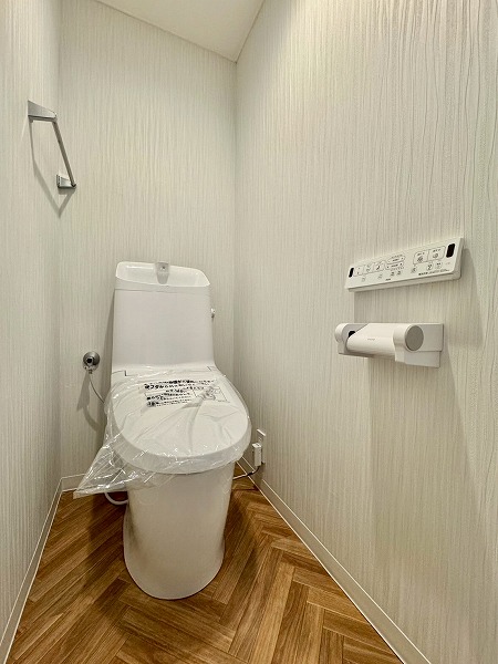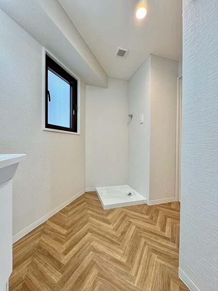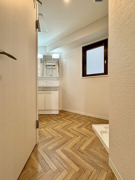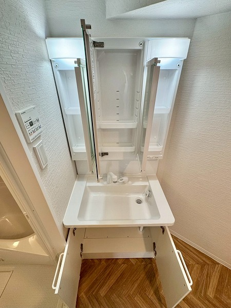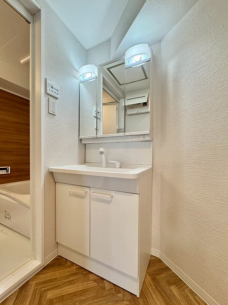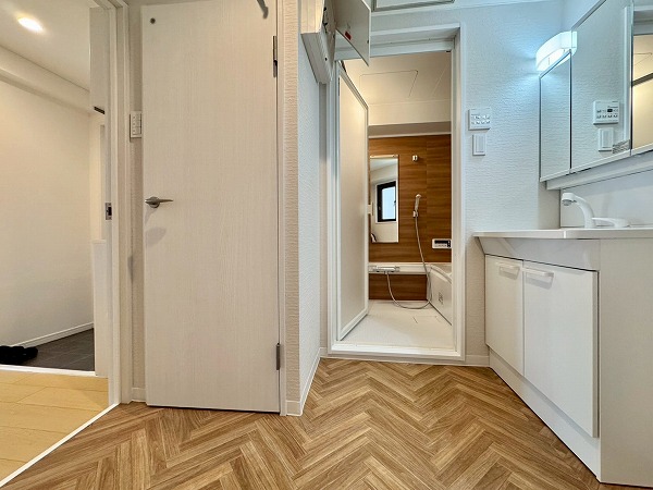 ホワイトを基調としたパウダールームに足を踏み入れると、まず目を引くのはヘリンボーン柄のフローリング。モダンなデザインと温かみのある木目が空間に上品なアクセントを添えています。3面鏡の洗面化粧台は鏡裏に豊富な収納を備え、身支度やメイクがスムーズに行える工夫が随所に。