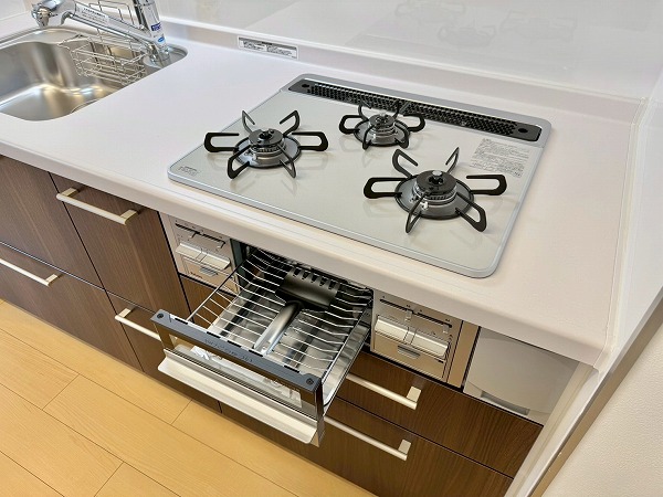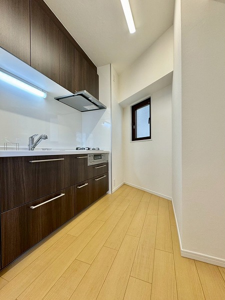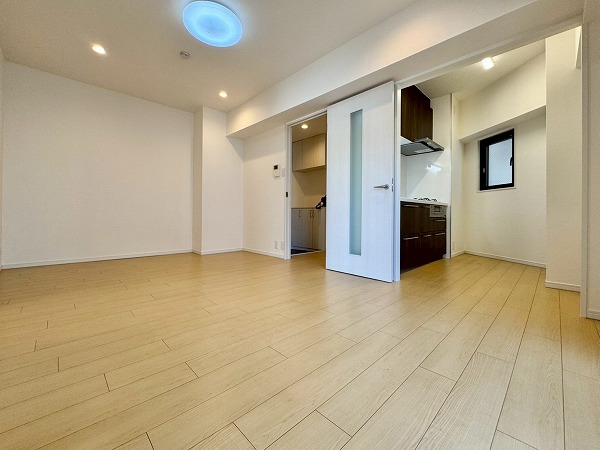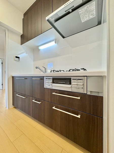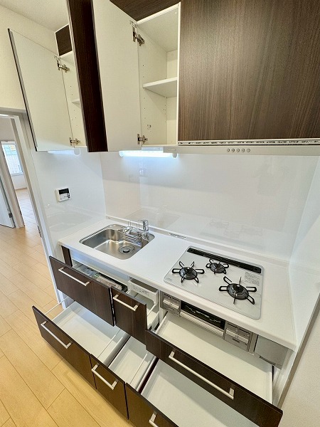 キッチンスペースは独立タイプでリビングダイニングから程よく区切られ、調理に集中できるのが大きな魅力です◎コンパクトながら作業動線がしっかり考えられているため、食材の下ごしらえや調理、後片付けまでスムーズに行えますよ。