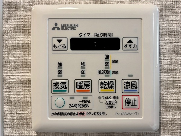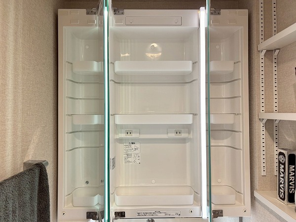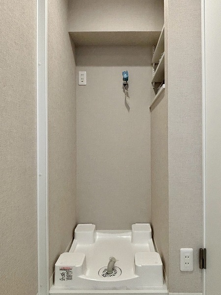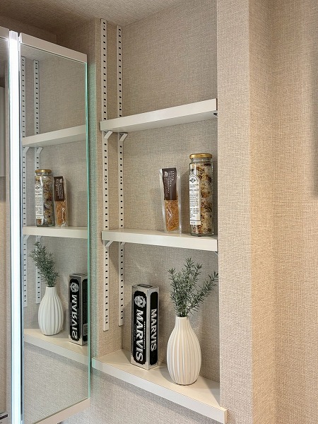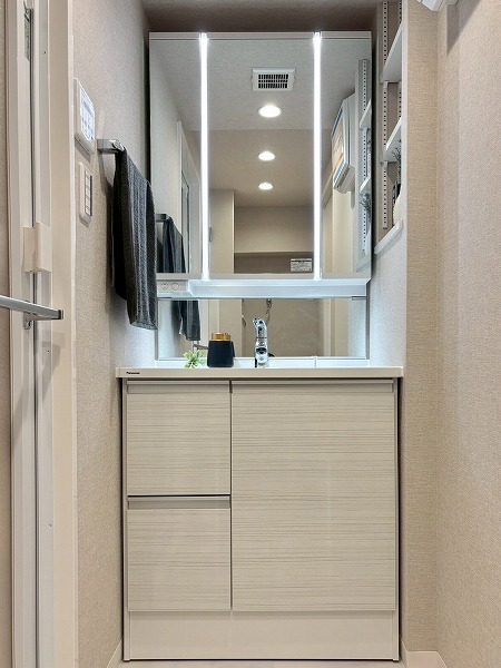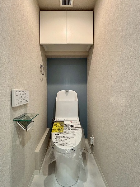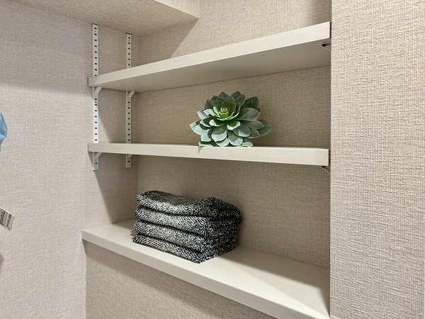 サニタリールームは玄関左手に。コンパクトな空間に洗面化粧台と洗濯機置き場、トイレ、バスルームがまとまっています。洗面化粧台と洗濯機置き場の横に収納スペースがあり、使い勝手が良さそうでした!トイレには明るいブルーのクロスを使用💙爽やかで清潔感がありますね。