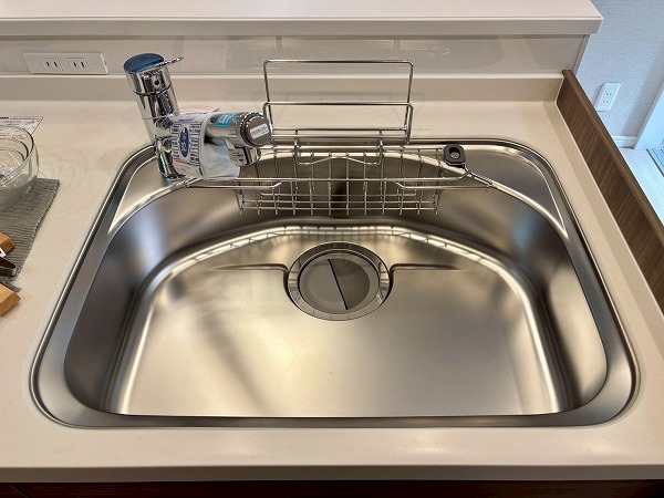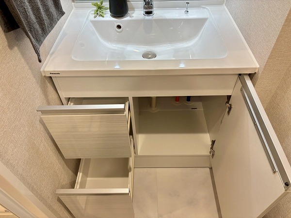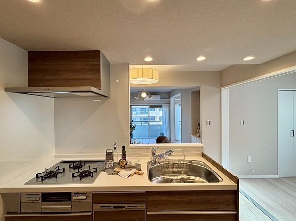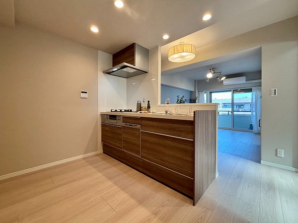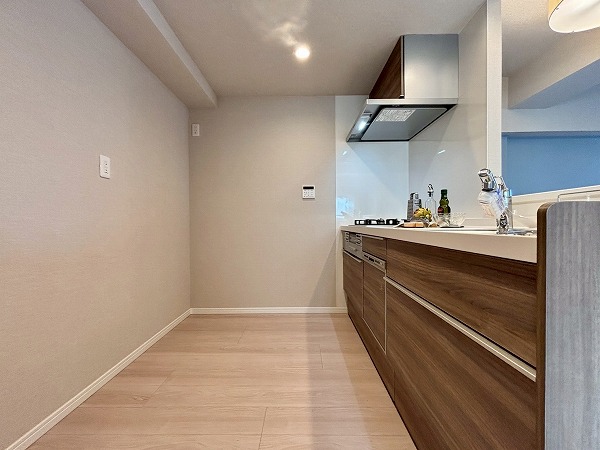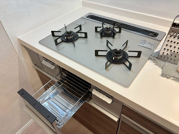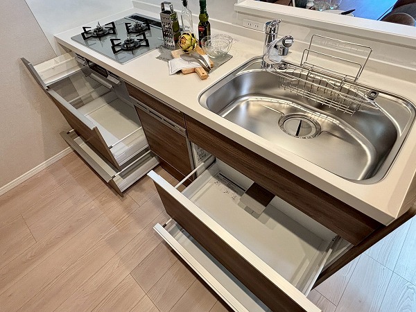 新規交換されたシステムキッチンなら気持ちよくお料理できますね。ワークトップが広く、食材の下ごしらえや盛り付けがしやすそう。また、食洗機を搭載しているのも嬉しいですね!スライドオープンタイプなので、屈まずにお皿を出し入れすることができ、腰への負担が少ないんです。