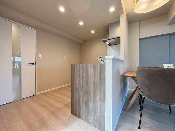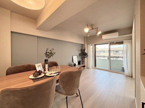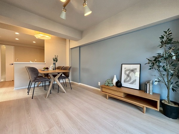 リビングダイニングキッチンはおよそ12.8帖。ダイニングテーブルやソファを置いてもまだまだゆとりが感じられるサイズ感ですね。ライトブルーが明るい気持ちにさせてくれるはず♡大きなアートや壁付けテレビが良く映えそう。エアコンが設置されているのもポイントです。