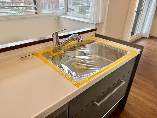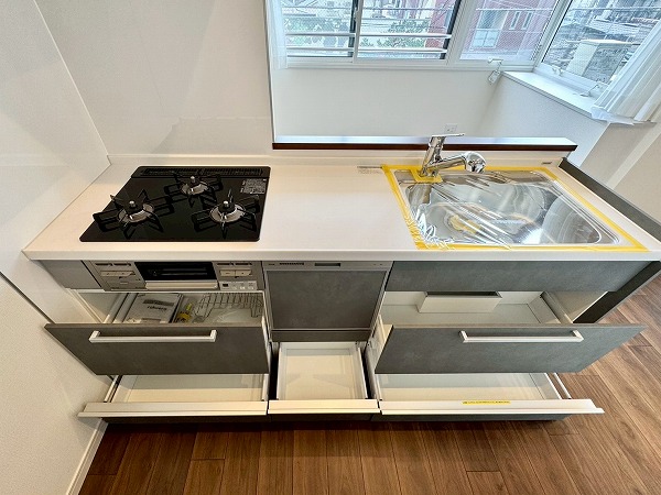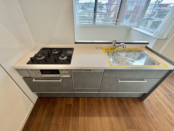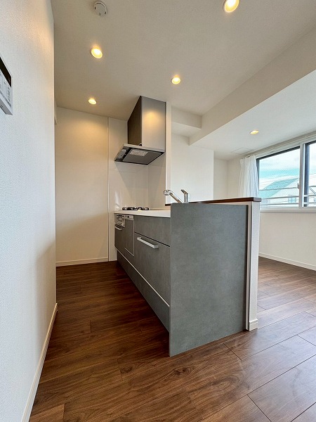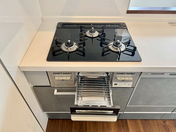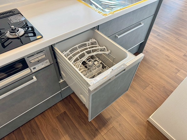 落ち着いたグレーが基調のシステムキッチンは人気の対面型。料理をしながら家族やゲストとの会話を楽しめる造りになっています。ビルトインコンロでお手入れも簡単!さらに食洗機を搭載しており、日々の家事を快適にこなせる頼もしい設備です♪