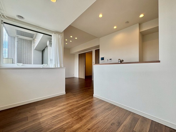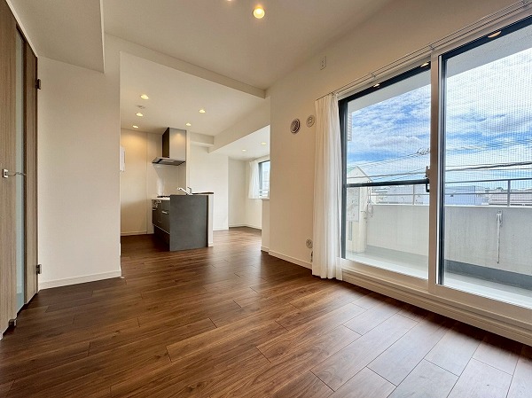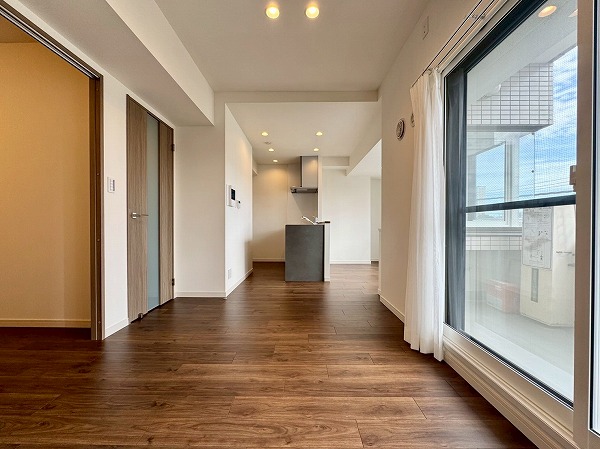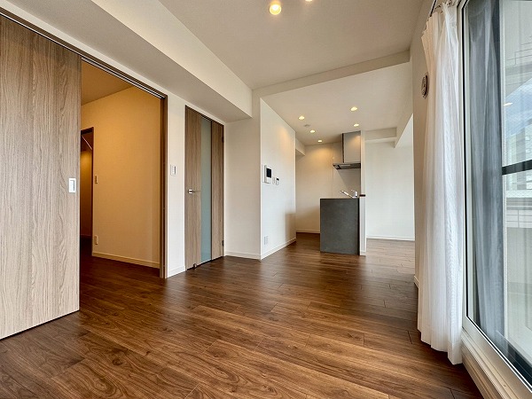 専有面積53.76㎡の2LDK。2025年7月にリノベーションが完了し、ピカピカな新築の様に生まれ変わりました。シンプルで落ち着きのある内装は飽きがこず、様々なテイストの家具をに合わせられます。東向きに大きな窓が設けられており、朝の気持ちの良い太陽の光がたっぷりと入り込む癒しの空間です。
