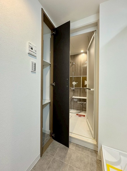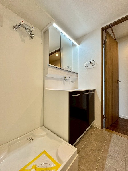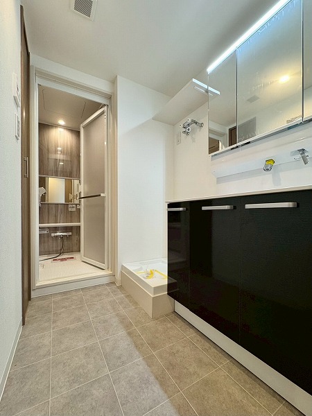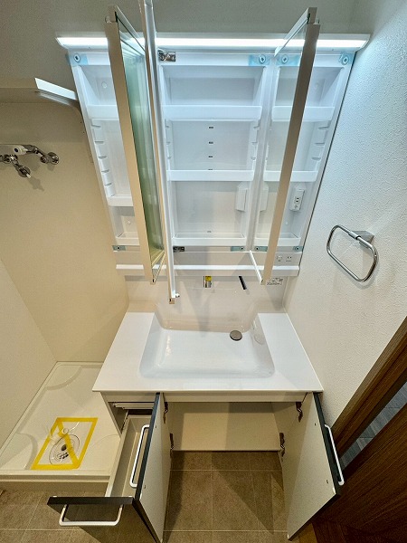 洗面化粧台・洗濯機置き場・浴室をひとつにまとめたパウダールーム。動線が短く効率的に使えるのが特徴です。ミラーキャビネット付きの洗面台には、スキンケア用品や細々とした物をすっきり収納可能✧