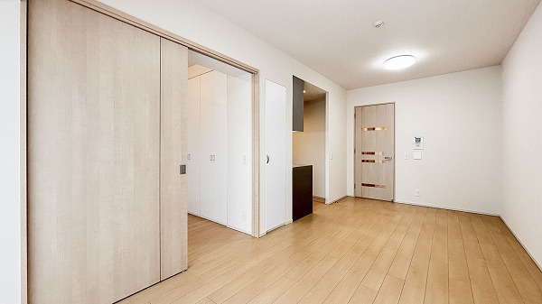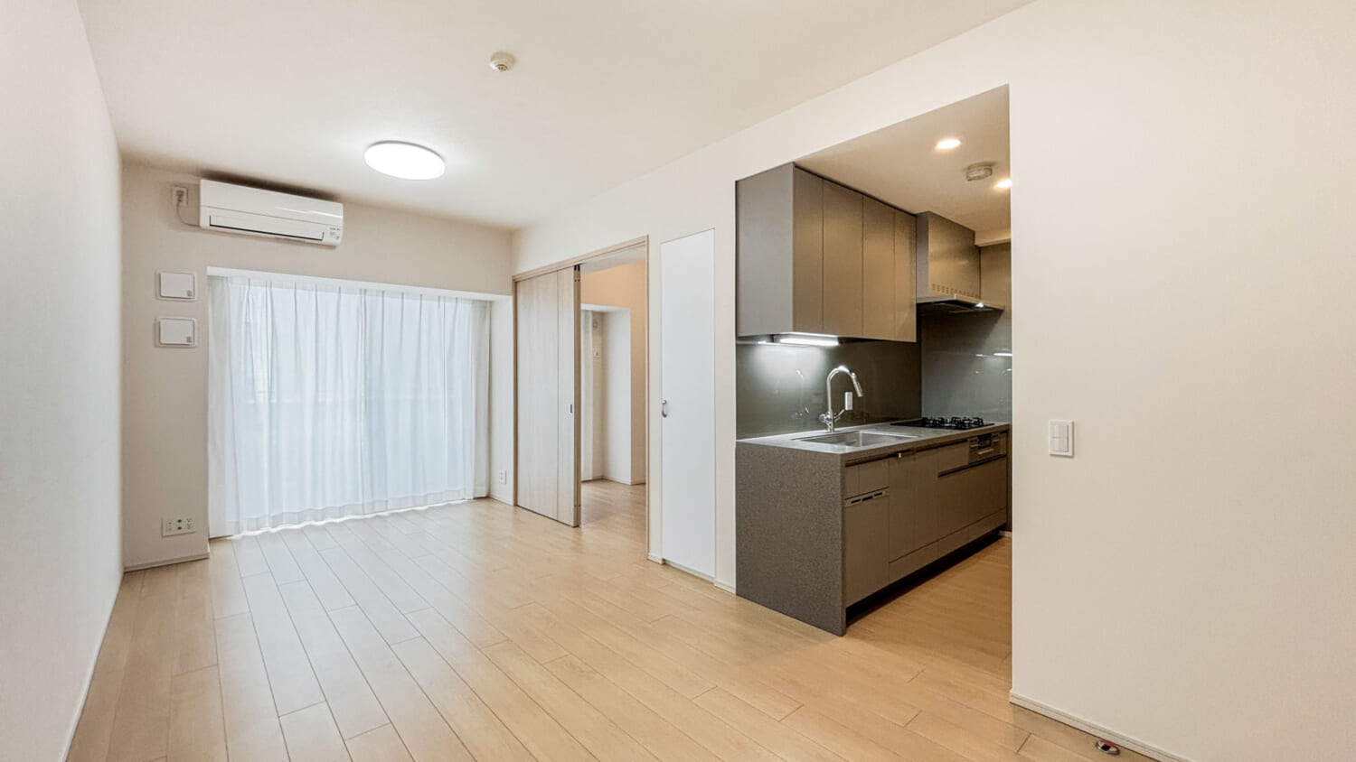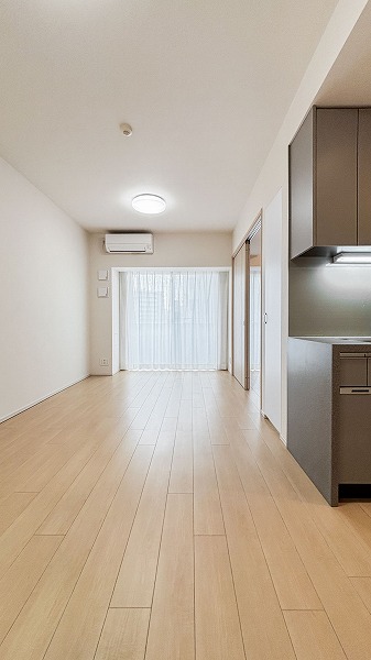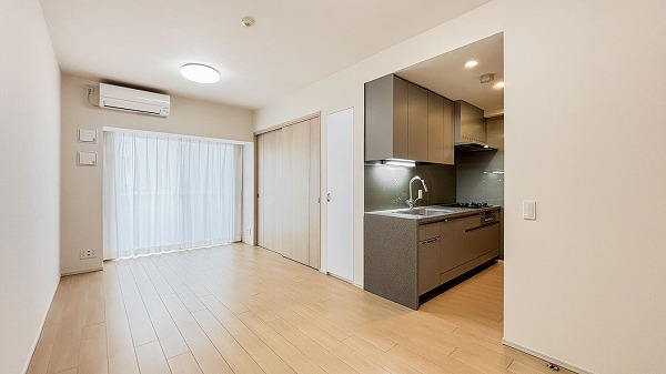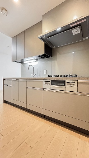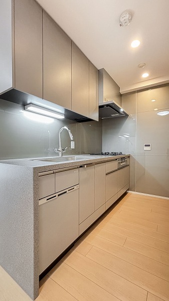キッチンスペースは約3.2帖で、仕切りはないものの独立した空間のような落ち着きがあります。グレーを基調としたシックな色合いがアクセントとなり、リビング空間とのコントラストを程よく演出。コンパクトながら動線が整い、日々の家事がスムーズにこなせる設計になっていますね♩