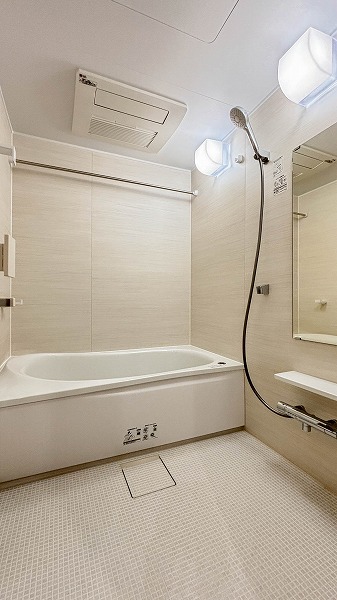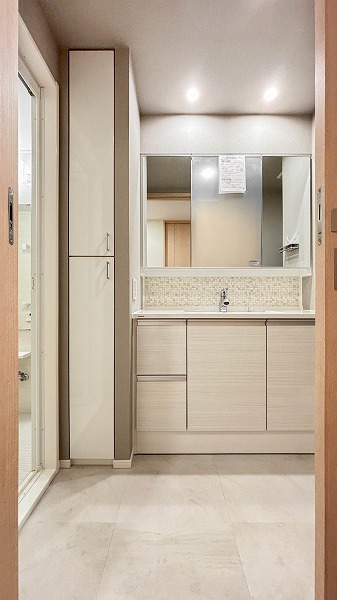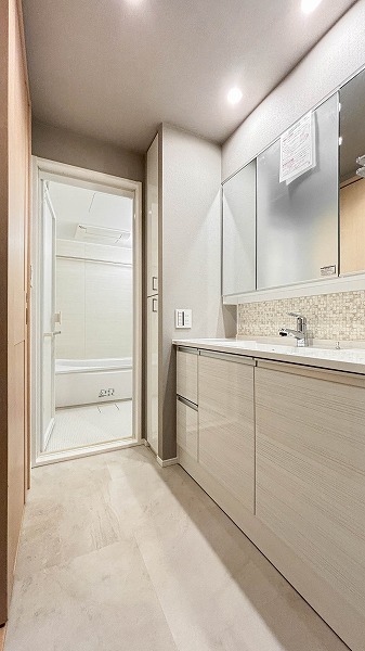 パウダールームには、洗面化粧台・洗濯機置き場・バスルームがひとつの動線にまとまった使い勝手の良いレイアウト。ワイドサイズの洗面化粧台は収納力も十分で、朝の支度や家事をスムーズにこなせますね✧