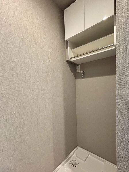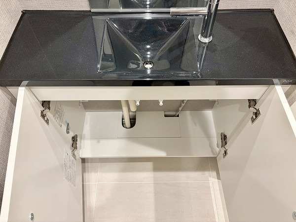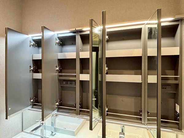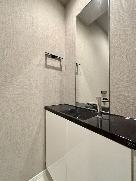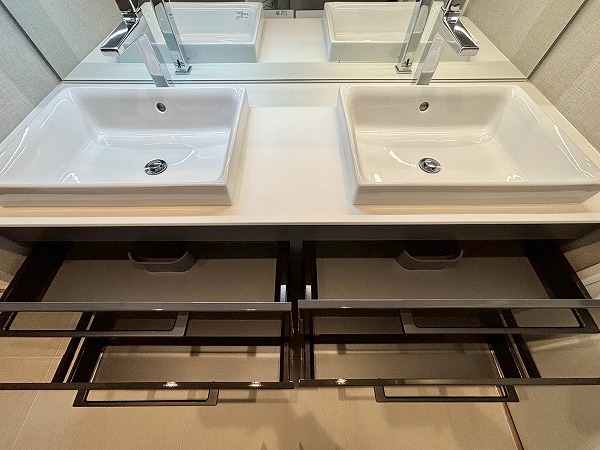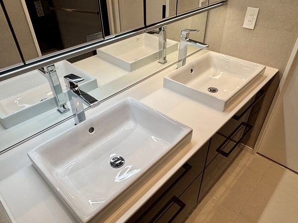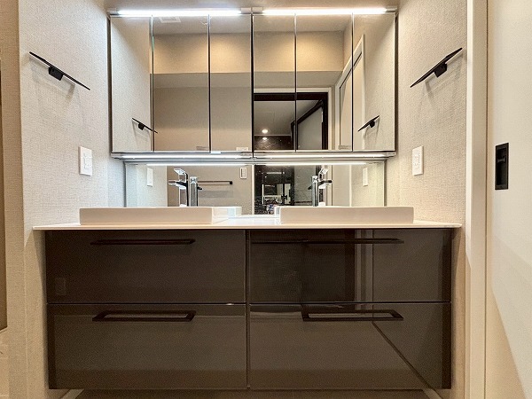 モノトーンを基調としたクールなサニタリールーム。洗面化粧台は、洗面ボウルが2つ並んだ2ボウルタイプを採用しています。ご家族と一緒に使用することができ、朝の身支度もストレス無く行えるはず。手をかざすだけでON・OFFが切り替えられるタッチレスライトを採用しています。