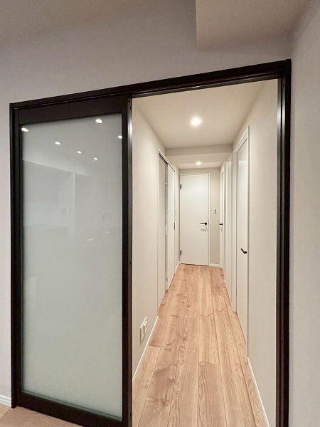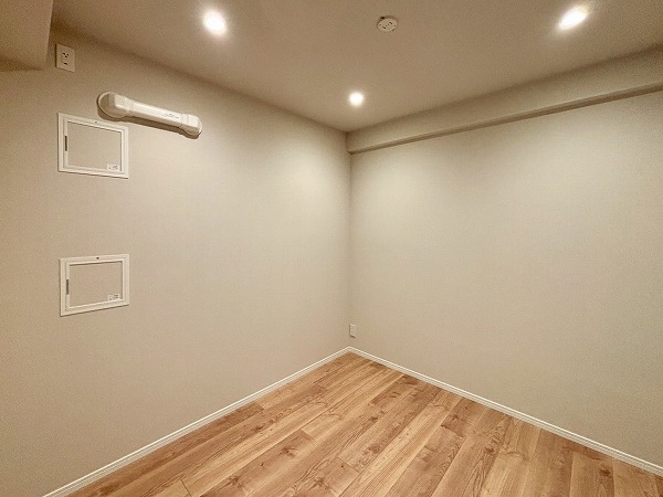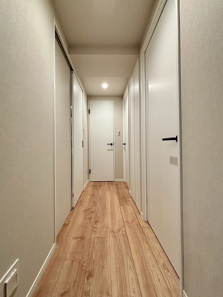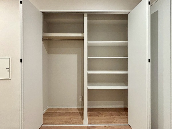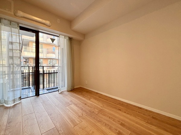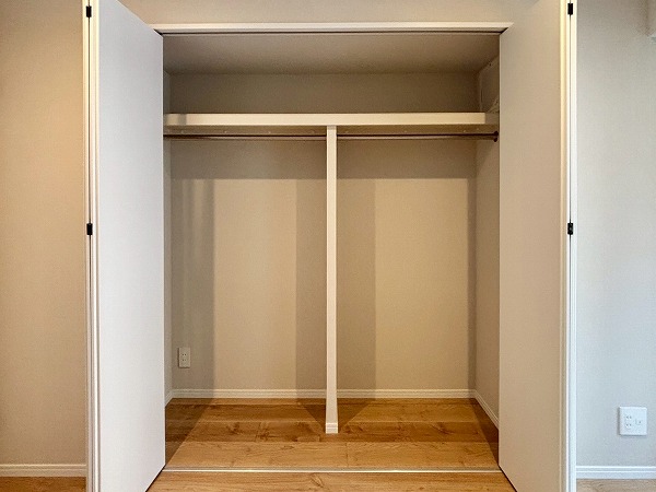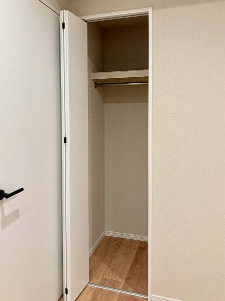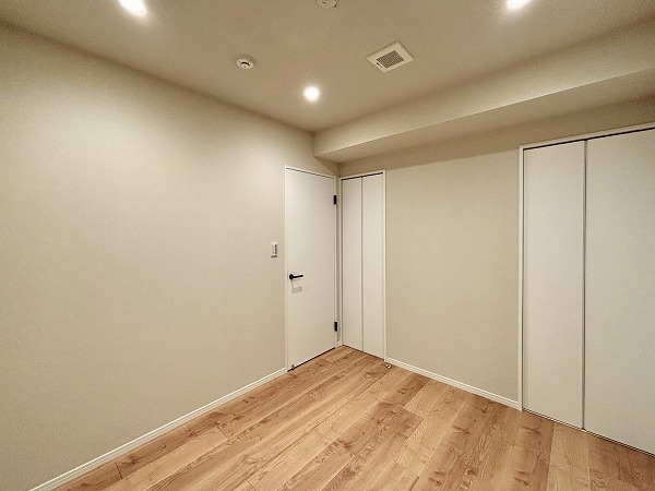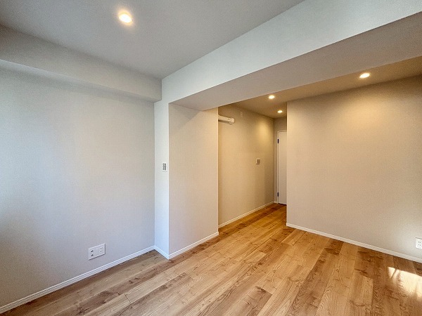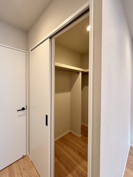 リビングダイニングキッチンには半透明なドアがあり、その先に洋室2部屋とサニタリールーム・トイレへが設けられています。PP分離がしっかりしている構造なので、急な来客時でもプライバシーを守ることができますね。こちらはおよそ6.0帖の洋室。ウォークインクローゼットは奥行きがあり、収納力抜群です。