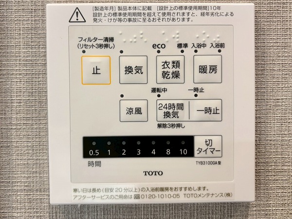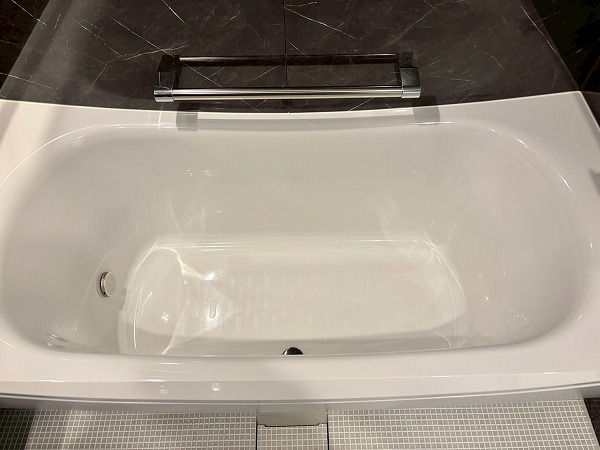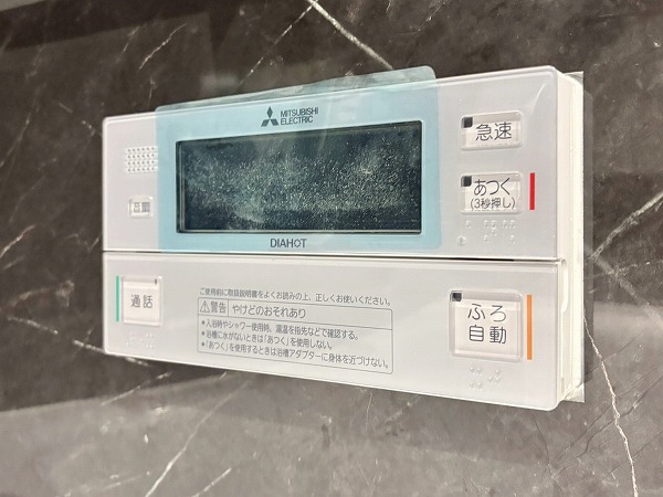 艶やかなブラックのパネルが使用されたバスルームは、ワイドな1620サイズ。これならその高い方や体の大きな方でも快適にご入浴いただけます。お子様と一緒にお風呂に入る際も狭さを感じにくいはず。部屋干しに便利な浴室換気乾燥機を搭載しているので、サンルームに干しきれないお洗濯物はこちらにどうぞ。