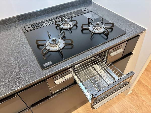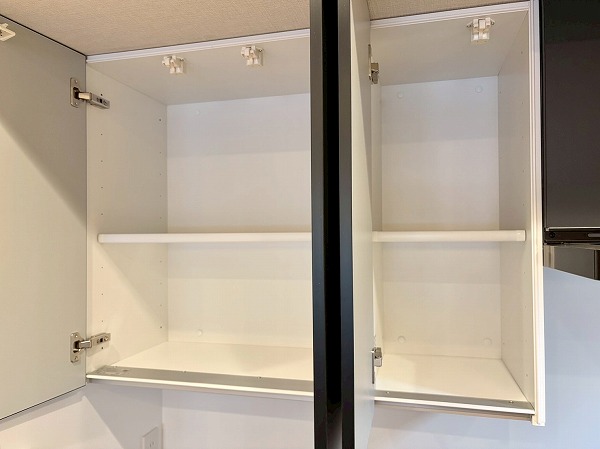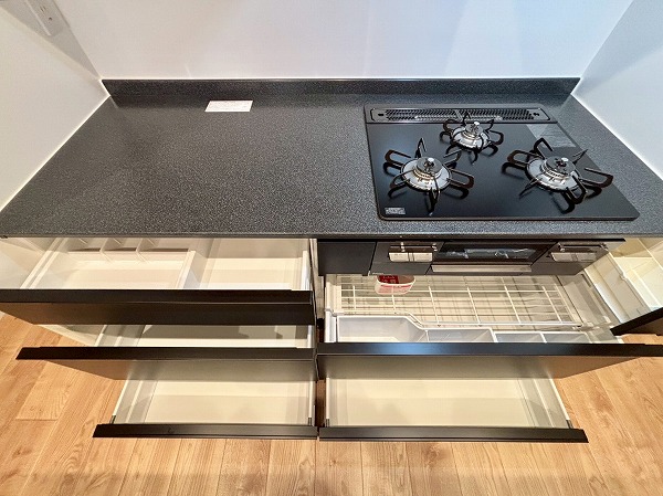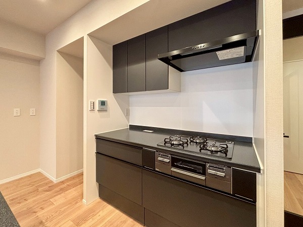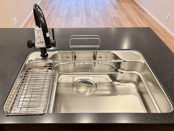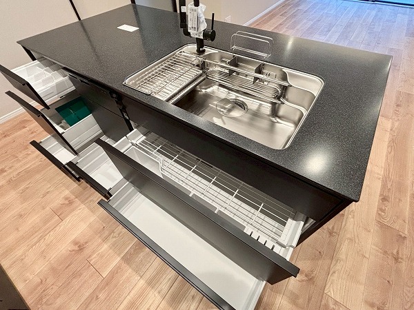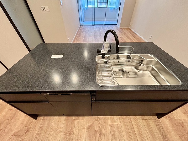新規交換されたシステムキッチンは、動線が良く作業スペースが広いと人気のⅡ型キッチン。ワークトップには高級感のある人工大理石が使用されています。傷が付きにくく、汚れも落としやすいというメリットも。収納豊富で、とっても使い勝手が良さそうですね。