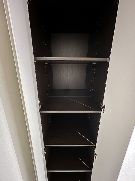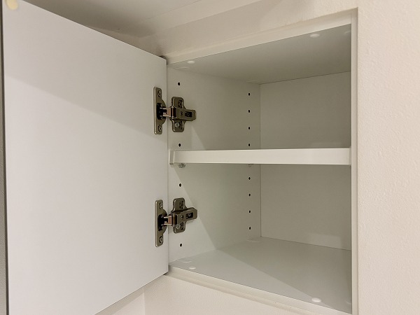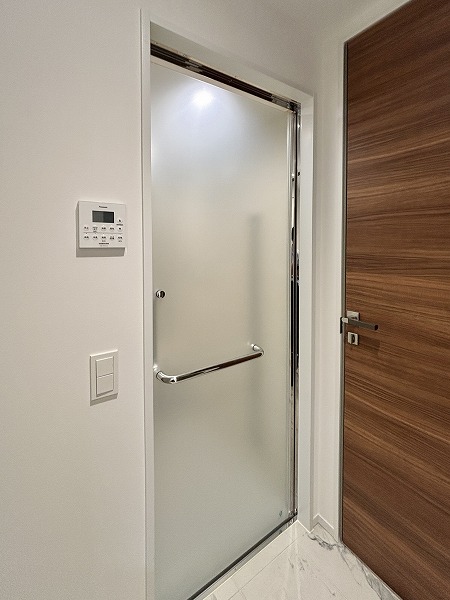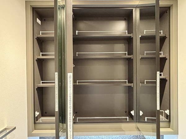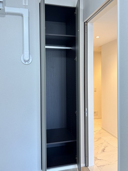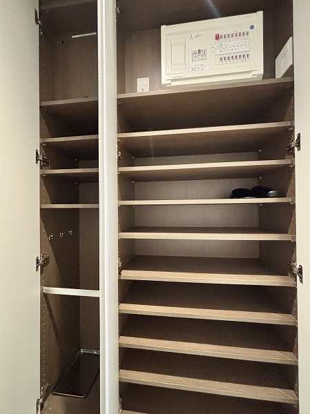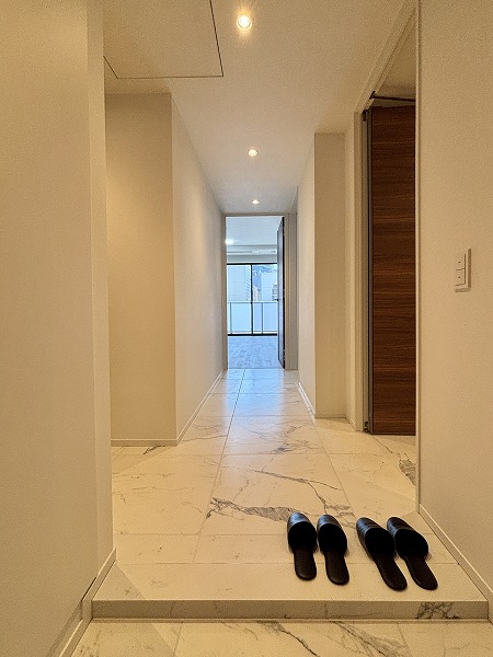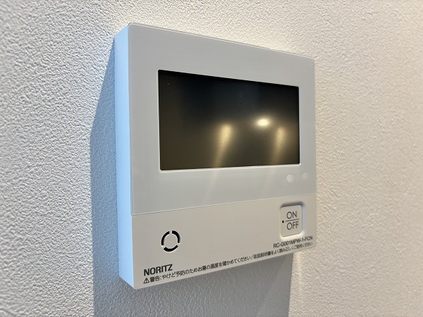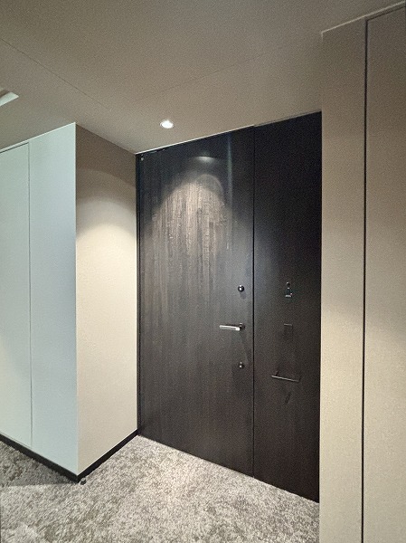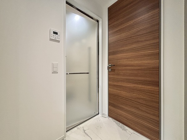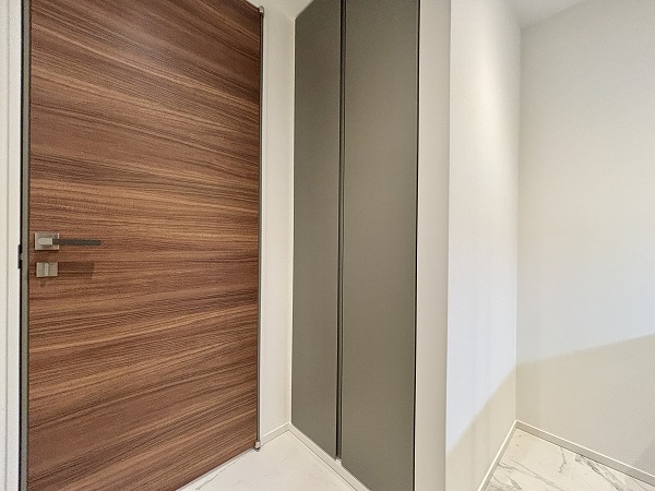 玄関ドアは従来の鍵に加え、タッチキーでも解錠可能。荷物で手がふさがっているときでもスムーズにご帰宅いただける便利な設備です。ホワイトを基調にした明るい玄関は、土間が広めに設計されており、スーツケースやベビーカーなどのアイテムも一時的に置いておけますね。