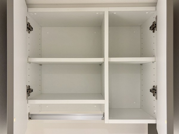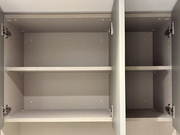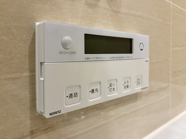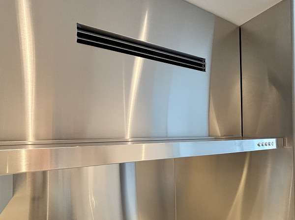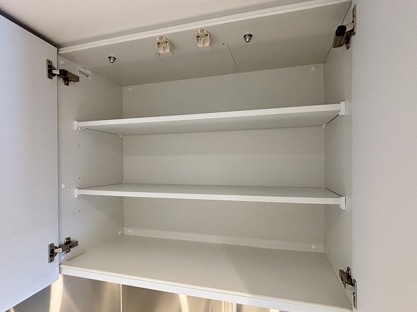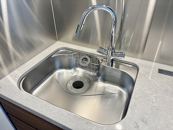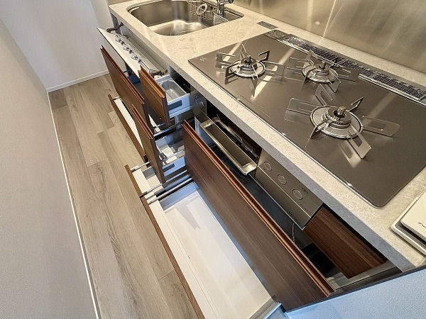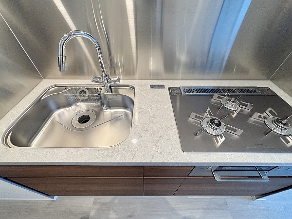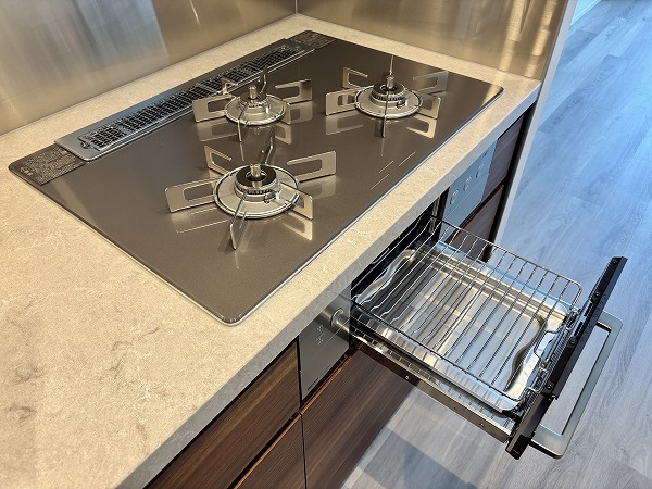 キッチンは約2.1帖の縦長コンパクトな造り。メタリックなデザインがスタイリッシュで、空間にモダンなアクセントを添えています。大きなシンクにはディスポーザーを備え、生ごみの量を減らすだけでなく臭いの心配も軽減。さらにグリル付きの3口コンロを活用すれば、調理時間の短縮も可能です◎