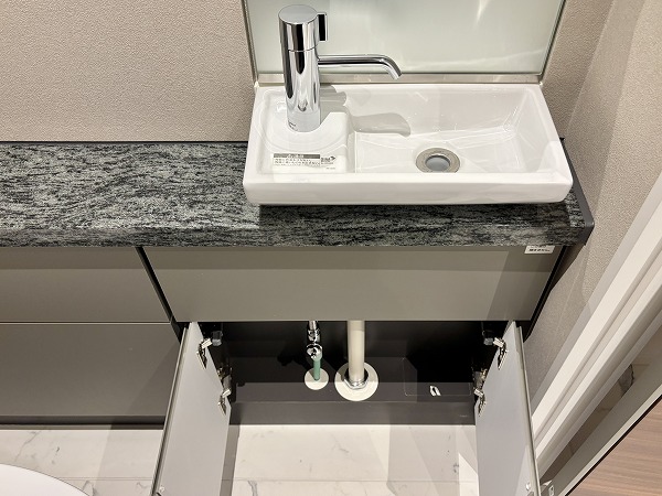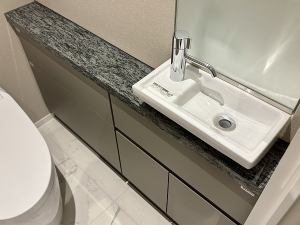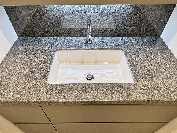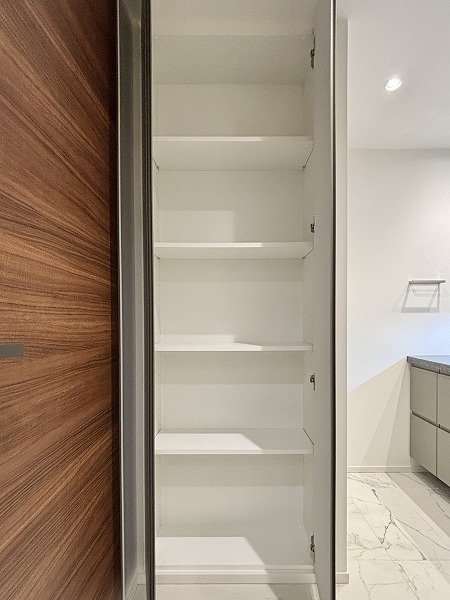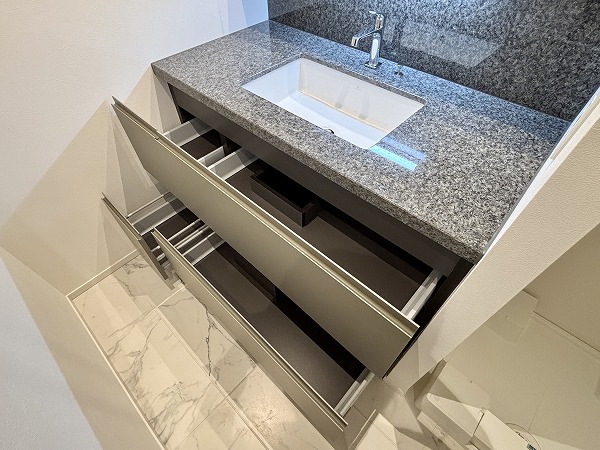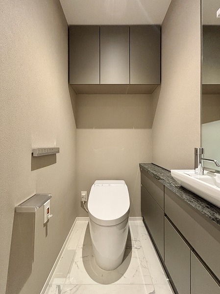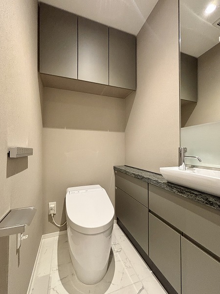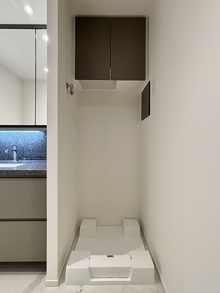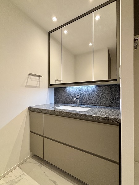 ホワイト×グレーで統一されたパウダールームは、石調タイルの床が上質さを演出。リネン庫と洗濯機置き場は入り口付近にまとめられ、奥にはバスルームと洗面化粧台を配置。動線が分けられており、忙しい朝でも快適にご使用いただけますよ♩