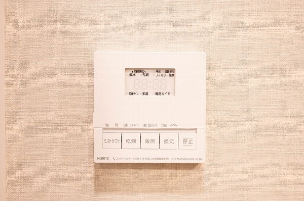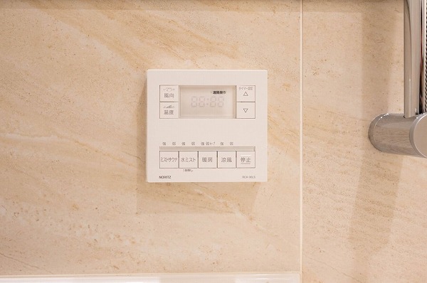 バスルームは上品なベージュのタイル張りで、落ち着きのある空間に仕上げられています。追い炊き機能を備えているので、帰宅時間が異なるご家族でも温かいお湯でゆったり。さらに浴室乾燥機も完備しており、雨の日や花粉の季節でも洗濯物を干せる便利さが魅力ですね♩