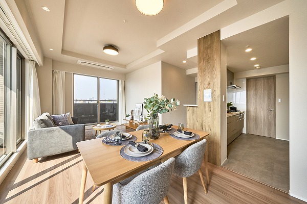 住まいの中心となるリビングダイニングは約12.7帖。横に広がる間取りが特徴で、くつろぎのリビングスペースと食事を楽しむダイニングスペースをしっかりと分けて使えます。2面から光を取り込む明るい空間に加え、床暖房を標準装備。冬場でもエアコンに頼りすぎることなく、快適で上質な時間を過ごせるのが嬉しいポイント。