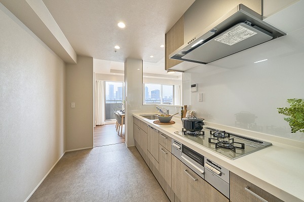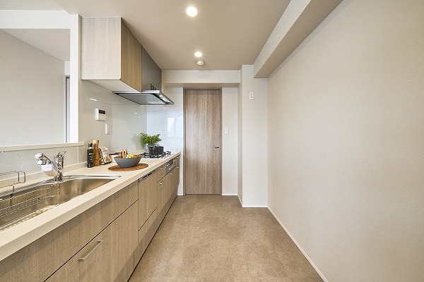 程よく独立感のある約4.2帖のキッチンは、生活感を抑えたい方に嬉しい半個室仕様。リビングと廊下をつなぐ回遊性のある動線で移動もスムーズです◎食洗機・ディスポーザーを備え、日々の家事負担を軽減。見た目だけでなく機能性にも配慮された、使い勝手の良いキッチンスペースです。