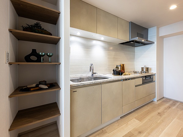 約5.2帖のキッチンスペースは、独立性の高い設計が魅力。調理中の匂いや煙が居室に広がりにくく、生活感を抑えた空間を保てます。大型の食洗機を備えており、食後の片付けもスムーズ。収納力も豊富でキッチン周りを常にすっきりと整えられる点も嬉しいポイント。