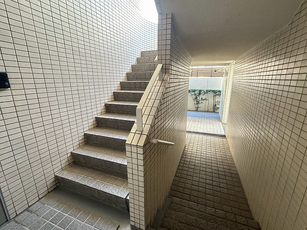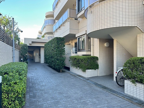 共用部は隅々まで清潔に保たれ、青々とした植栽が整えられていました。敷地内には駐輪場も備わっています。