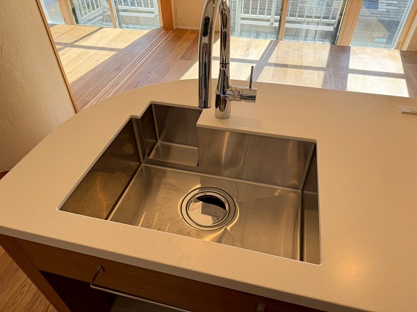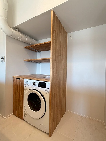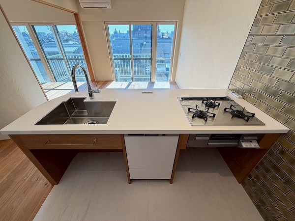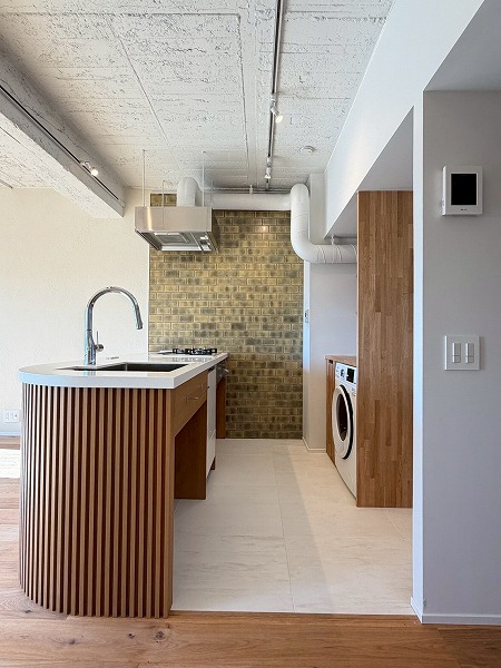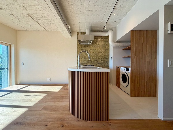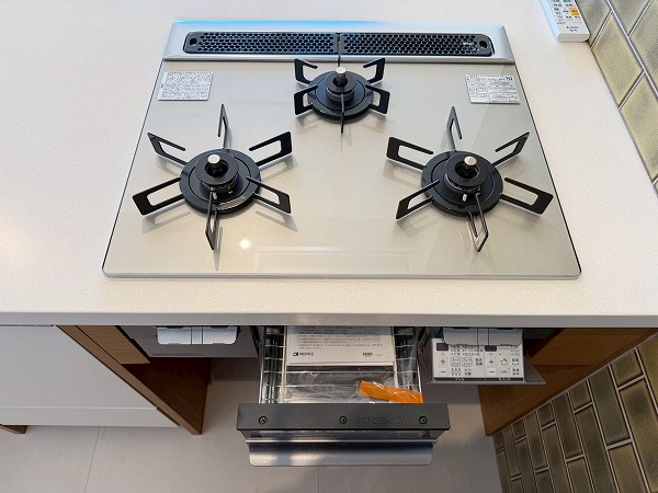 まさにシンプルイズベストなデザインのシステムキッチン。複数品の同時調理が可能なグリル付き3口コンロ&便利な食洗機が搭載されています。背後は洗濯機置き場になっていて家事動線もスムーズ♪