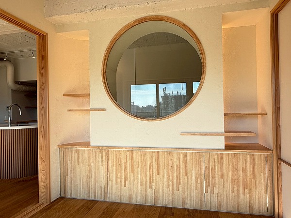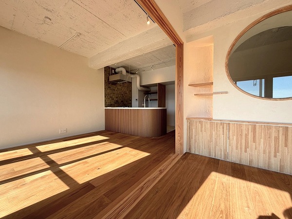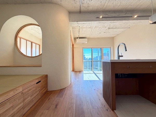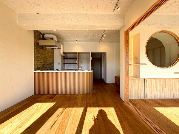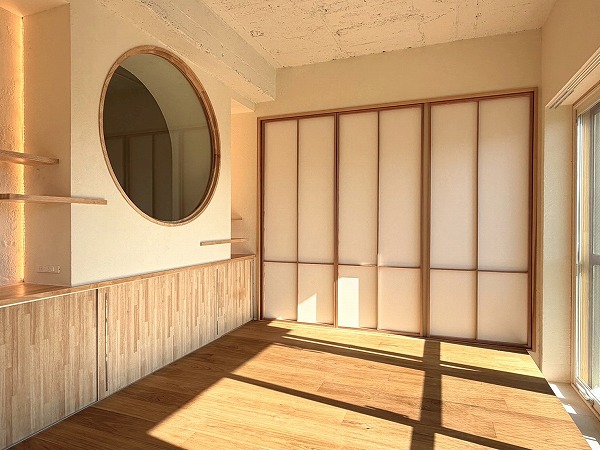 和室の裏側に広がるこちらの洋室は、南向きの窓からたっぷりと光が差し込む心地よい空間です。大きな障子風の建具や丸窓、間接照明がデザインのアクセントになり、シンプルな中に上質さを感じさせる仕上がり♪