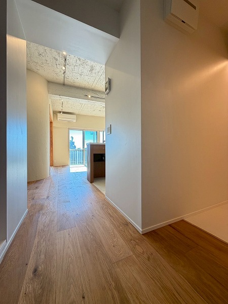 ダイニングの手前にはキッチンスペースがあります。開放感があり、ご家族同士でのコミュニケーションが取りやすい間取り。エアコン1基も備わっているので、引越し直後から快適な暮らしをスタートできます。