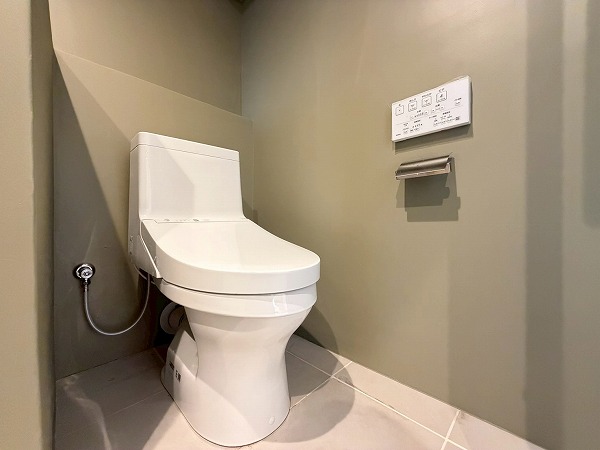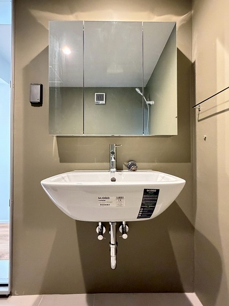 落ち着いたグレートーンで統一されたサニタリールームは、まるで海外のアパートメントのような雰囲気。バス・トイレ・洗面台をひとつにまとめたレイアウトは、空間を広く見せる効果があり、視界が抜けて開放感を感じられます。