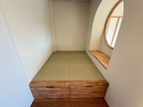 段差がやわらかな木の質感と畳の香りが心地よい、こだわりの小上がり和室スペースです。床下には引き出し収納を備えており、季節物やリネン類をすっきりしまえる実用性も魅力。