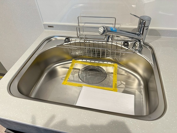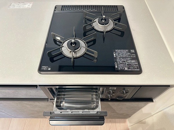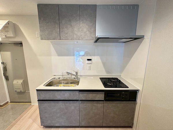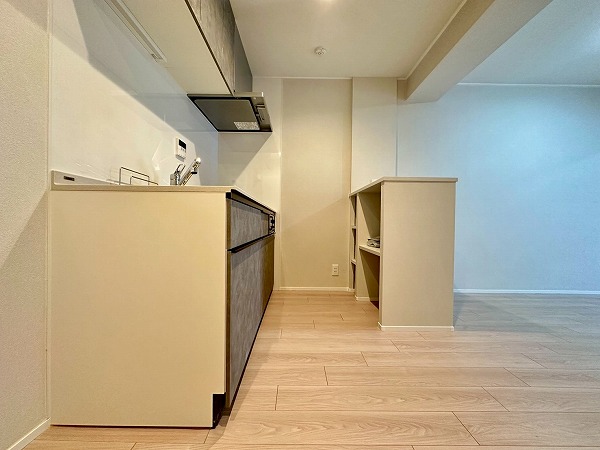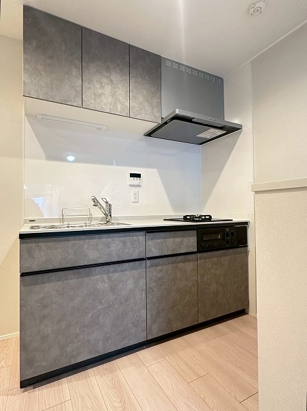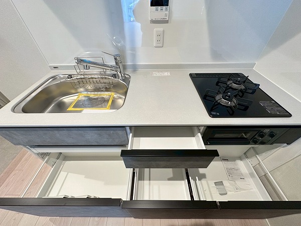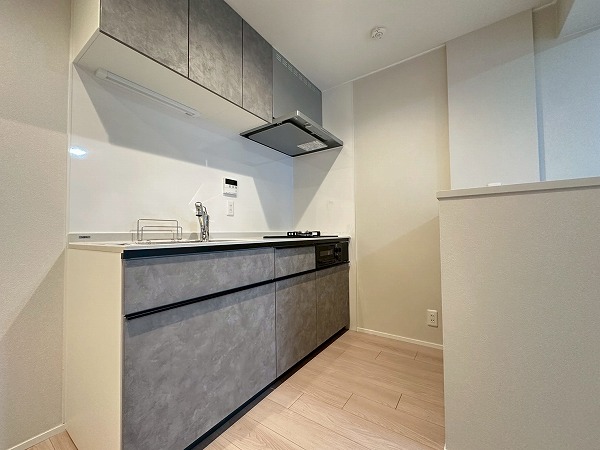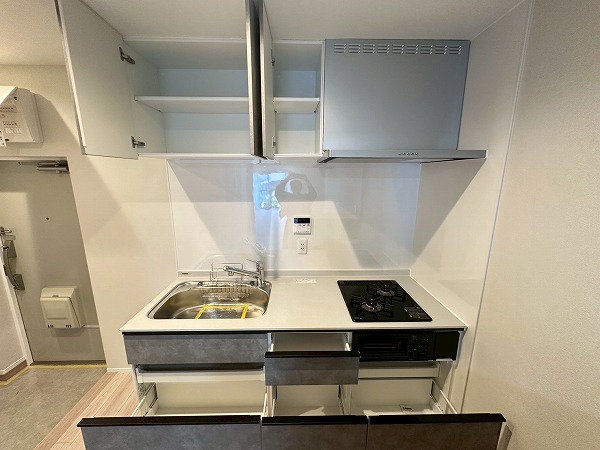 調理に集中できる、壁付けタイプのシステムキッチン。シンプルで清潔感溢れるデザインですね。上下に備わった収納スペースには、かさばりやすい調理器具もスッキリ整理可能。背後にもカウンターが備わっています。