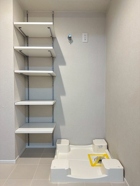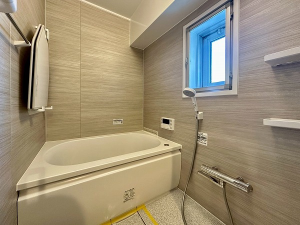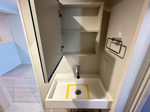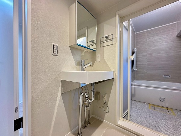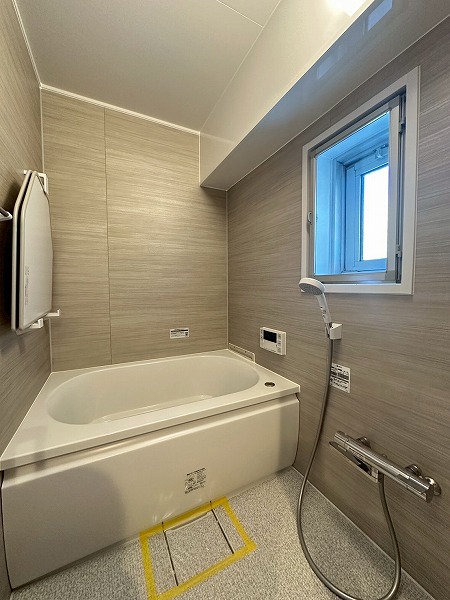サニタリールームには洗面台・洗濯機置き場・バスルーム・トイレが集結しています。バスルームには快適なご入浴に欠かせない追焚き機能&浴室乾燥機を搭載。小窓付きなのも嬉しいポイント。