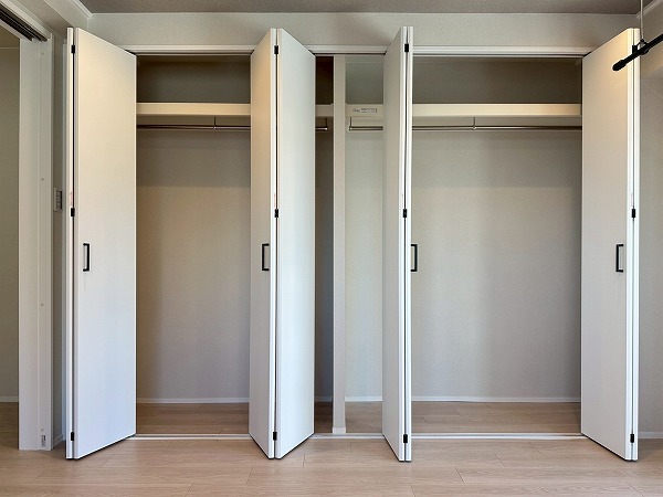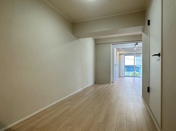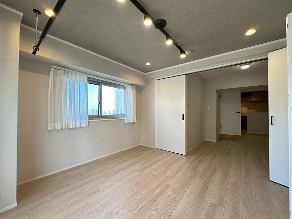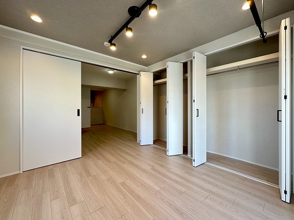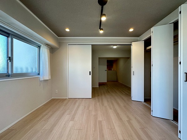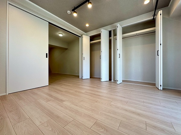 リビングの奥には、おおよそ6.3帖の洋室が併設されています。スライド扉を開けてリビングと繋げることでより広々と感じられました。大容量のクローゼット付き♪大切なお洋服も綺麗に保管できます。