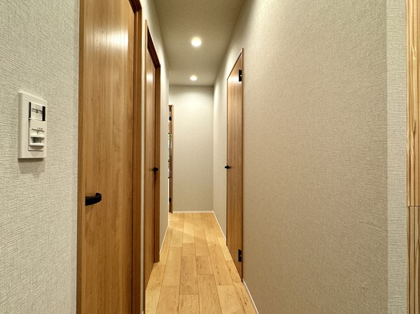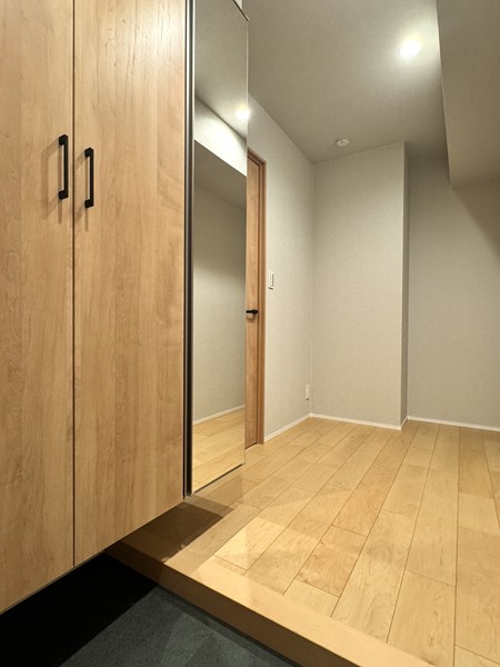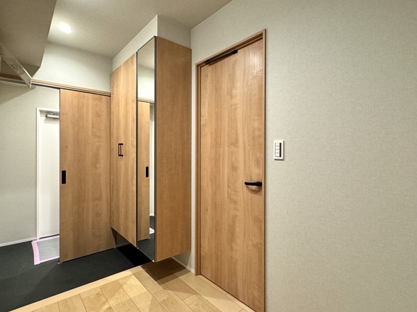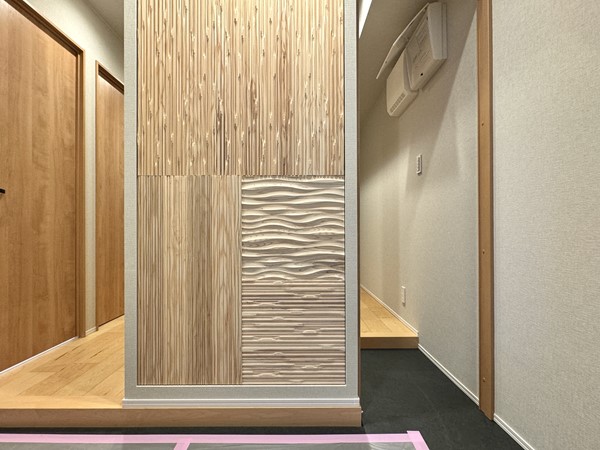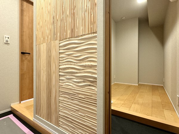 玄関に入ると、正面には意匠の違う木を組み合わせたお洒落な木目壁が。ゆったりとした土間は2ヶ所に小上がりが設けられ、左は廊下、右はサービスルームへ進むことが可能です。