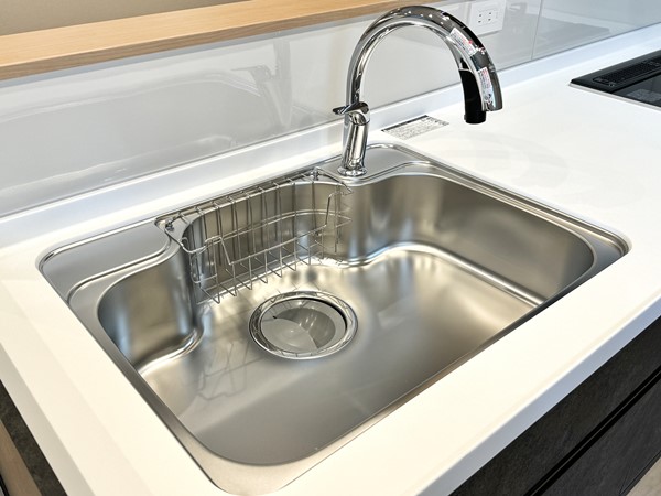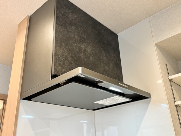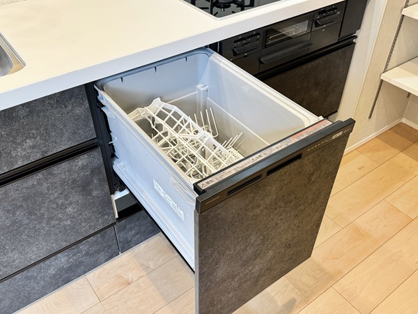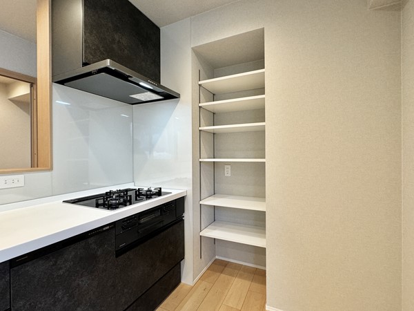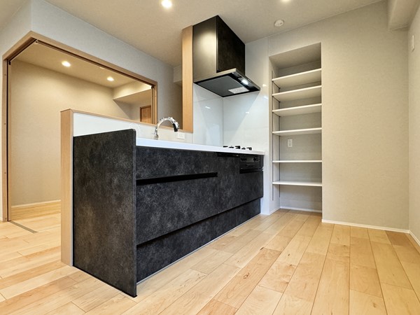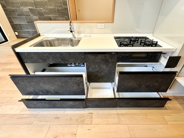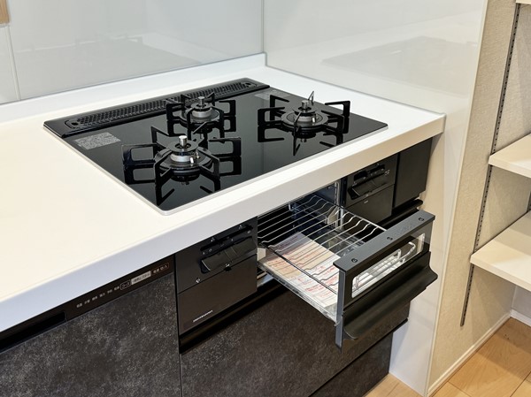 重厚感のあるダークグレーのシステムキッチン。コンロの右側には使い勝手の良いオープン収納が。棚板の高さを自由に変更できるのでスペースを効率良く活用していただけるのではないでしょうか。