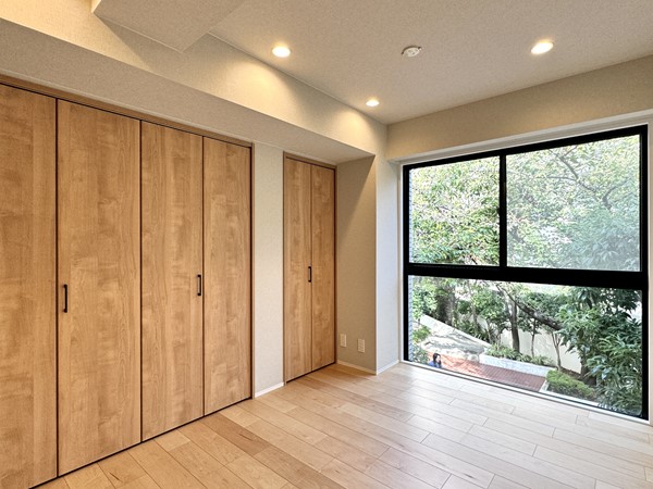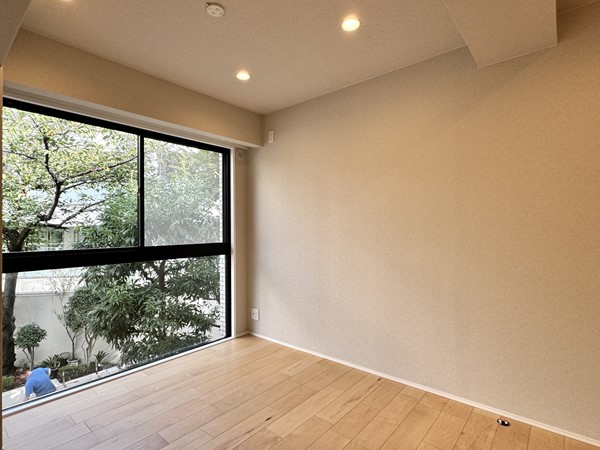 約5.6帖の洋室には中庭に面した大きな窓がありました。北西側向きの窓で強い直射日光が射し込まないため、日焼けを気にせずカーテンを開けて爽やかな眺望をお楽しみいただけます。