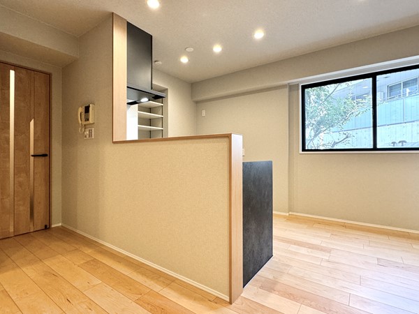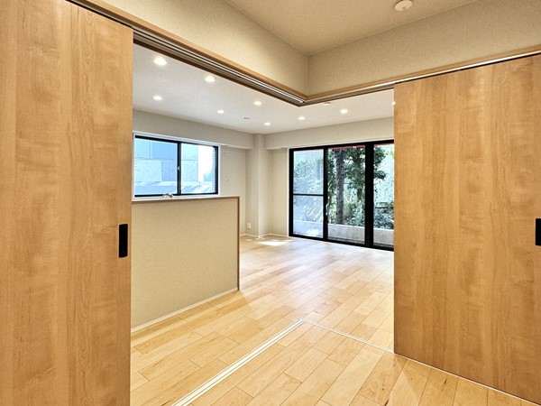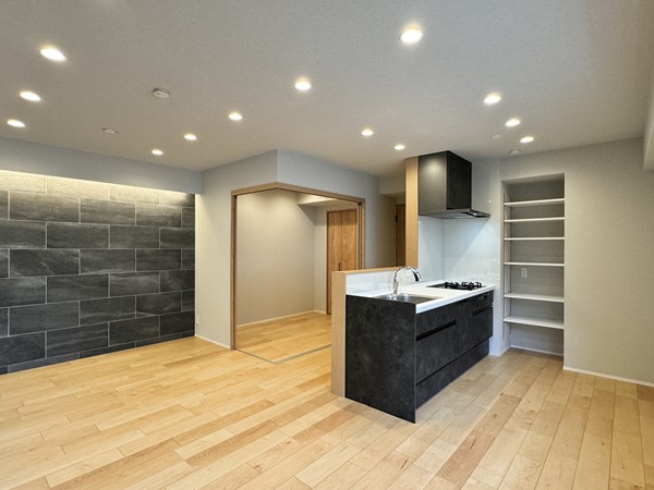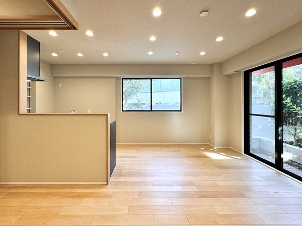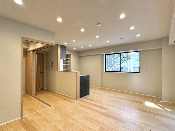 約20.5帖のゆったりとしたメインルームが魅力の2SLDK。リノベーションが施され、温かみのあるナチュラルな空間に生まれ変わりました。照明にはダウンライトが取り入れられ、お部屋を均等に明るく照らしてくれています。