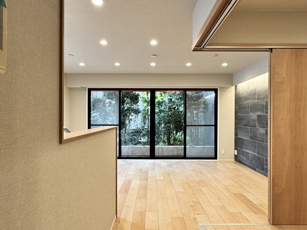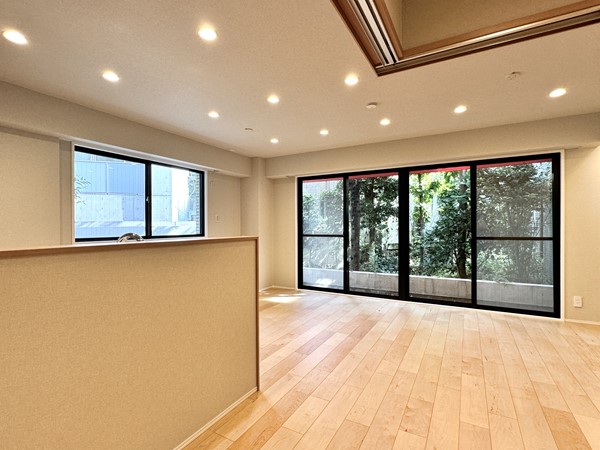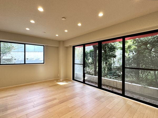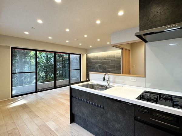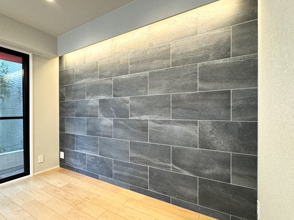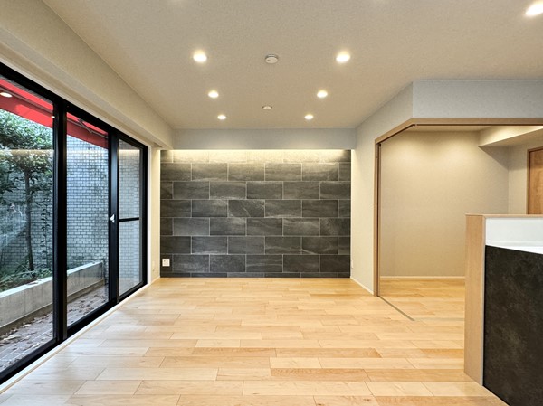 メインルームの大きな窓からは爽やかなグリーンビューがお楽しみいただけます。まるで森のなかの別荘のような清々しい日々をお過ごしいただけそうです。ブラックの窓枠やグレーのアクセントタイルによってお部屋が洗練された印象に。