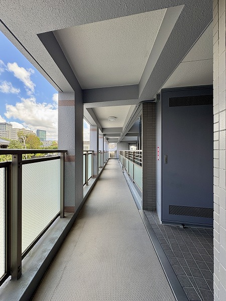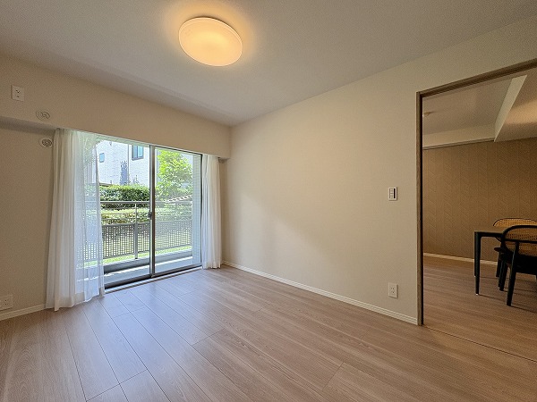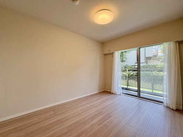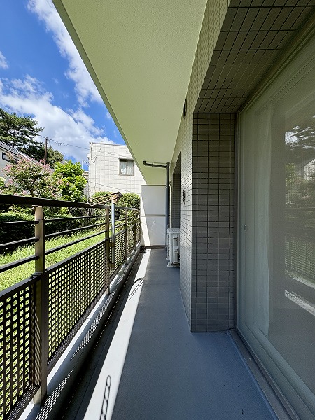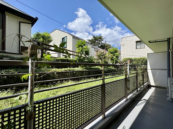 バルコニーからは青空と豊かなグリーンのコントラストを楽しむことができ、穏やかな時間を感じられる空間です。周囲に高さのある建物がないため1階ながらもしっかりと陽の温かさを感じられ、明るく心地よい光が差し込みますよ☀