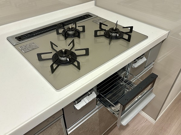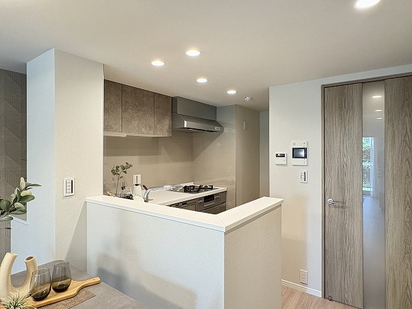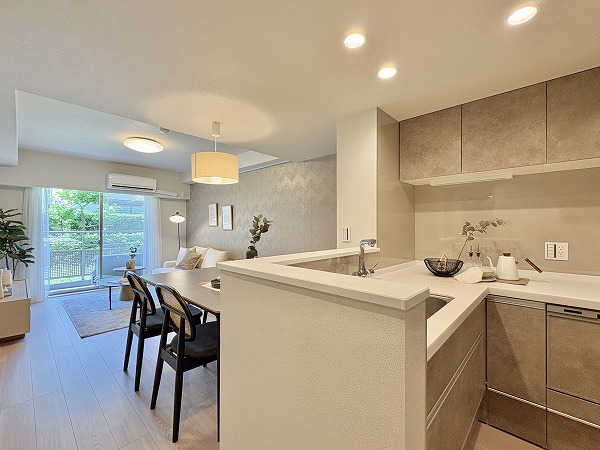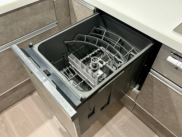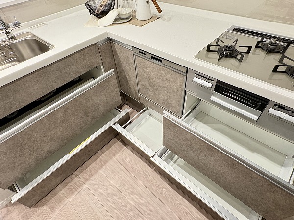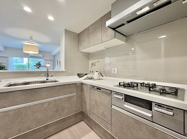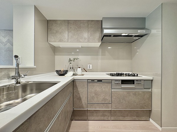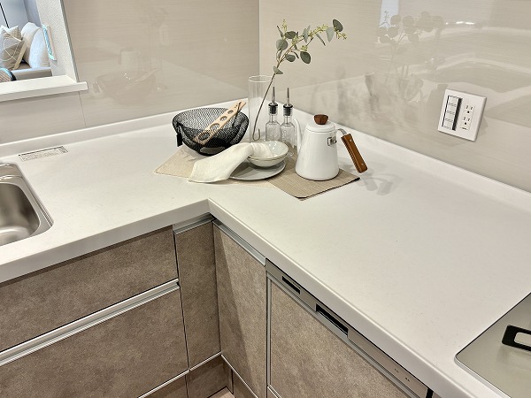 リビングと繋がる対面式のL型キッチンは、家事動線に優れた使いやすい設計。広々としたワークトップで調理スペースも十分に確保され、複数の料理を同時に進められます。さらに、食洗器付きで後片付けもスムーズ♩