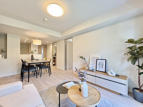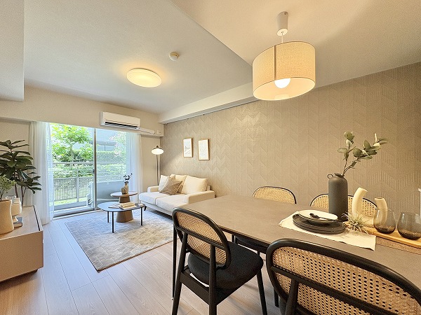 ご紹介するのは1階部分に位置するファミリータイプの3LDK。新規リノベ済みで、ナチュラルで可愛らしい内装に仕上がっています♡南西向きの採光が確保され柔らかな自然光が差し込み、ご家族で過ごすメインルームは開放感と温かさに包まれていますよ☀
