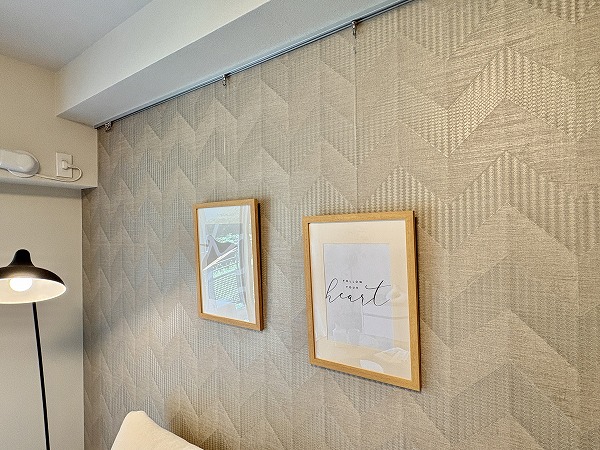 メインルームのアクセントウォールの一面にはピクチャーレールが取り付けられ、アートや写真を自由に飾れるスペースとして活用できます。お気に入りの絵やインテリア小物をディスプレイすることで、気軽に空間に個性や彩りをプラスできますね❀