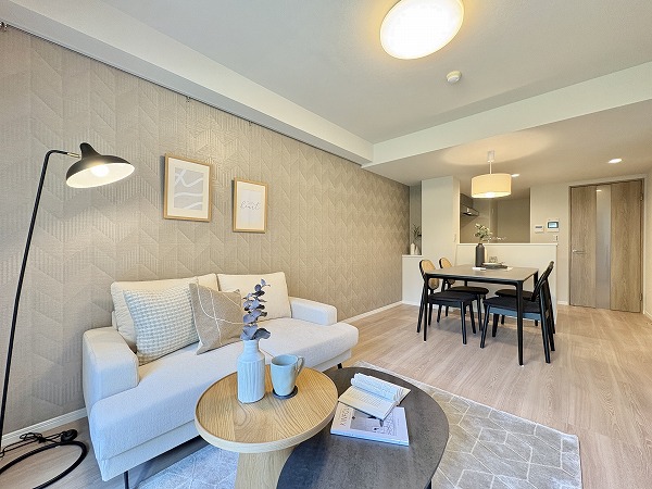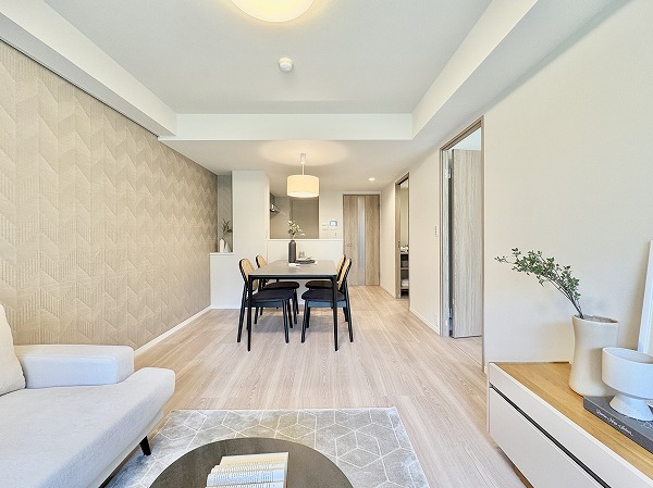 約14帖のリビングダイニングキッチンの壁面にはベージュのヘリンボーン柄アクセントウォールが施され、温かみと上品さをプラスしています。床や建具とのホワイト×ベージュのカラーコーディネートで家具も同じテイストで揃えると統一感のある空間が完成しますよ✧