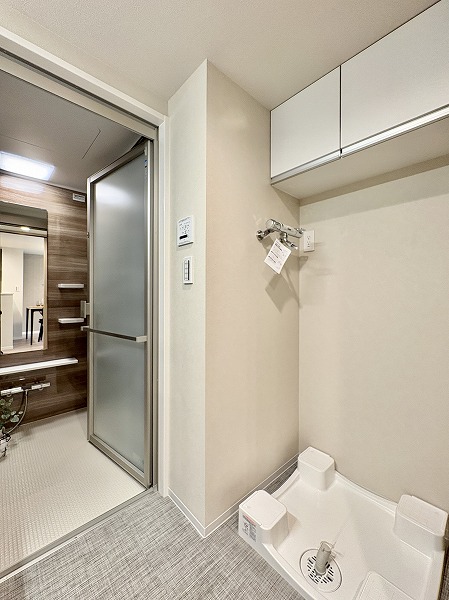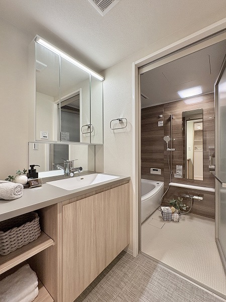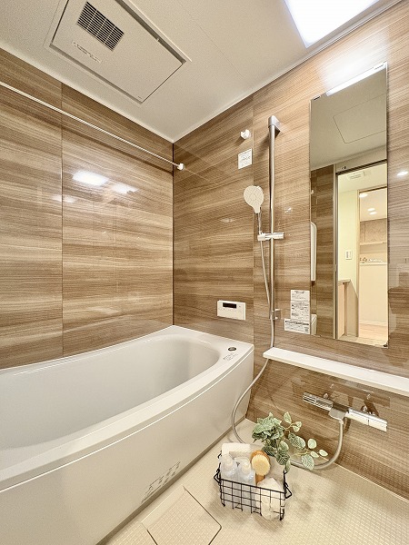 バスルームは木目の鏡面パネルをチョイスし、温かみと高級感のある空間に仕上がりました!追い炊き機能付きで、家族の入浴時間が異なってもいつでも快適に温かいお風呂に入れるのが嬉しいポイント。雨の日のお洗濯は浴室乾燥機にお任せしましょう♩