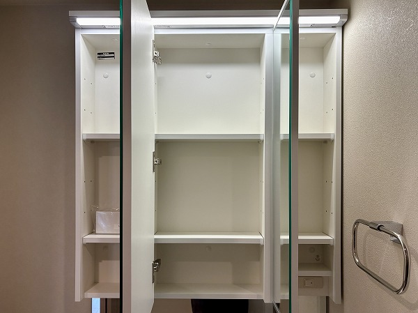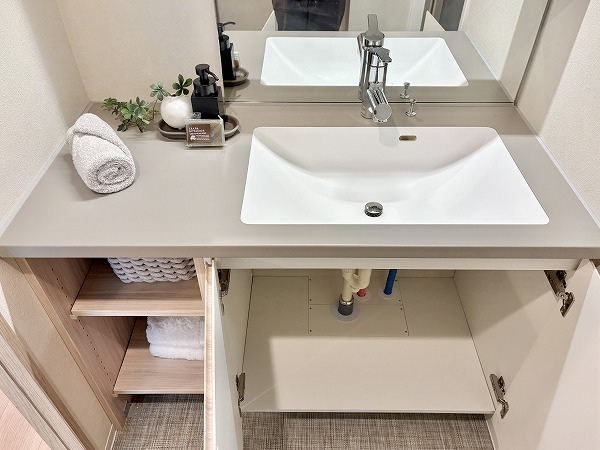 洗面化粧台はグレーのカウンターを採用し、シックで落ち着いた雰囲気。左側にはスペースが設けられ、メイク用品や小物を広げてドレッサーのように使えるのが嬉しいポイントです。忙しい朝もゆったりと準備ができ、毎日の身支度がより快適になりますね✧