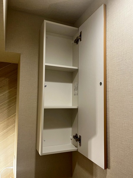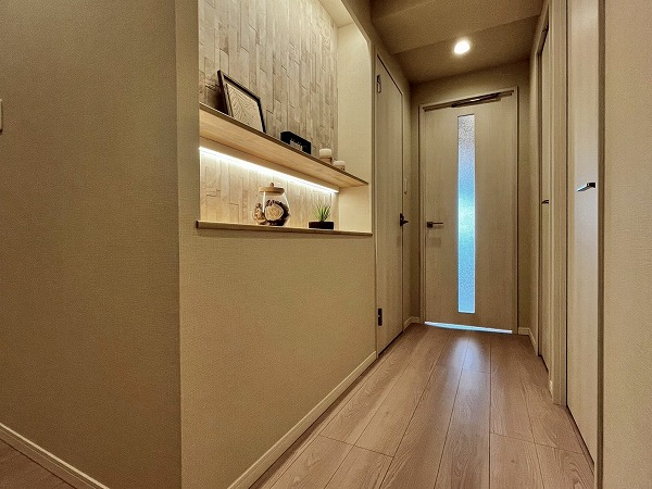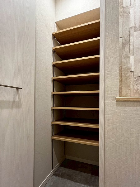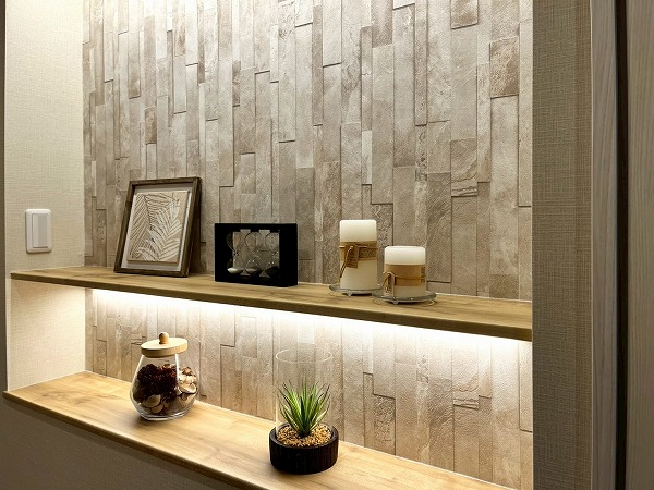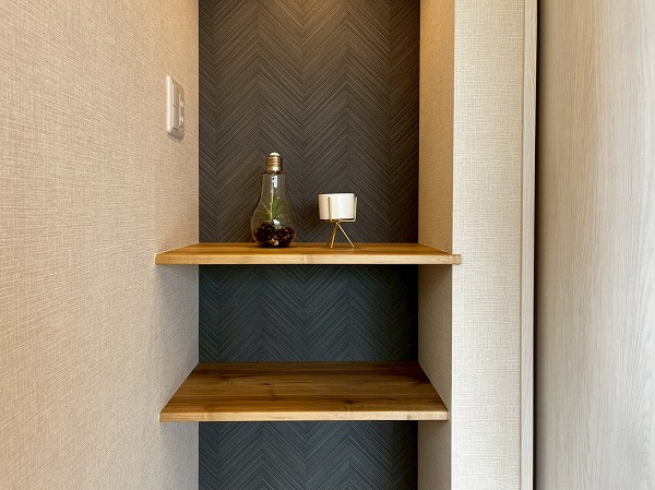 収納スペースが至る所に設けられている今回のお家ですが、なんとメインルームにも魅力的な4段シェルフが。家族の大切な宝物たちを、暖かな照明が照らしてくれます。なにを飾ろうか考えるだけでもワクワクしますね✧