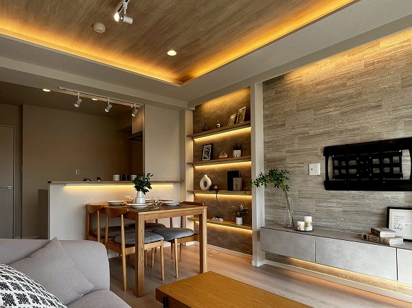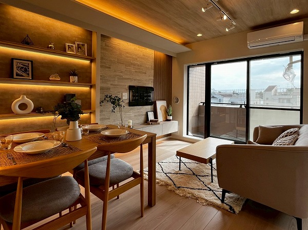 今回ご紹介するのは、ファミリーで暮らすのにぴったりな、フルリノベーション済み3LDKのお部屋です。リビングダイニングキッチンは約11.9帖と開放感抜群。木目の温かな天井に間接照明が柔らかに反射して、なんともほっこりする空間ですね。