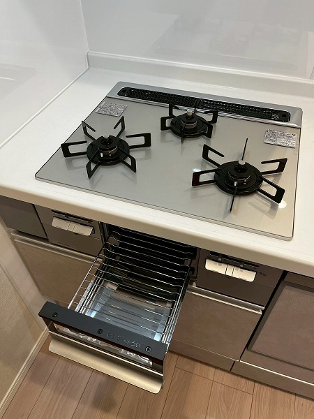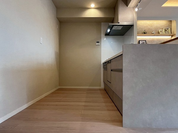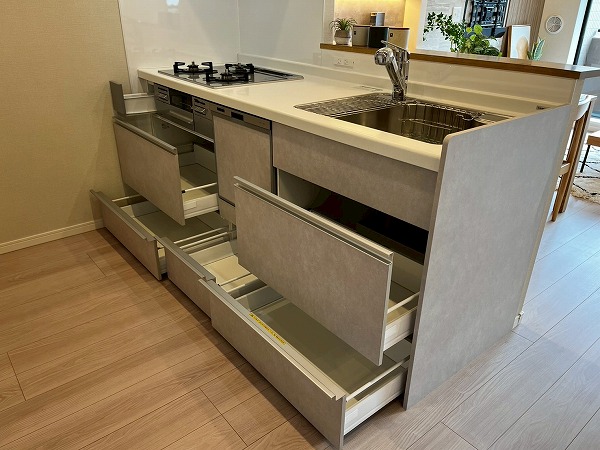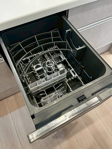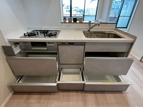 見通しの良い対面キッチンは、3口コンロ&食洗機付きでお料理好きの味方。リビングルームのご家族と会話しながらお料理できます。収納が深めなので、大きな鍋やホットプレートなども収納できますよ。キッチン後ろ側のスペースが広めのため、冷蔵庫や食器棚を置いても同線が確保できそうです。