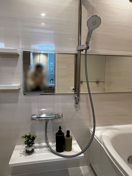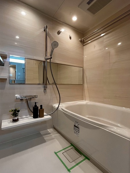 横長の鏡が印象的なバスルーム。ゆったりサイズのバスタブに、お子様も使いやすい高さ調節機能付きのシャワーです。浴室乾燥付きで、梅雨の洗濯物問題も解決!浴室暖房&涼風機能までついているので、1年中快適なお風呂タイムが期待できそうですね。