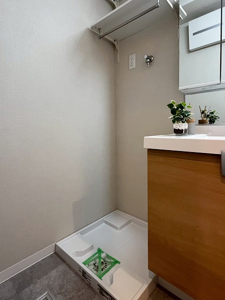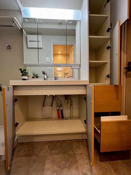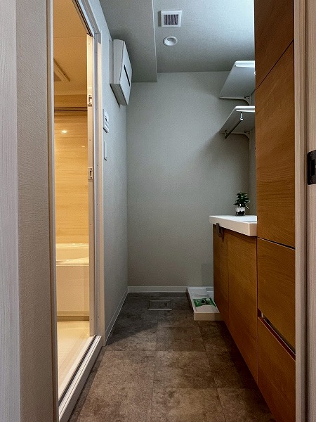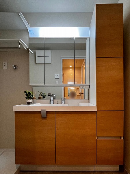 ライトブラウンが目を引く洗面所。広々とした鏡の裏や背の高い棚の中にもたっぷりの物が入ります。家族の生活用品や洗濯洗剤のストックなどはすべてここにまとめることができそうです。