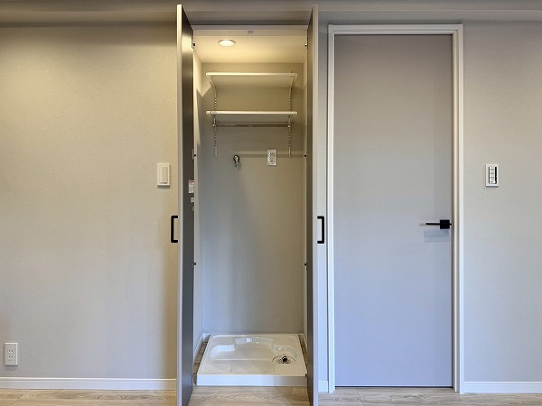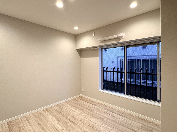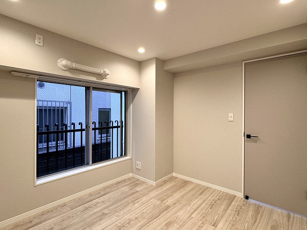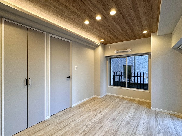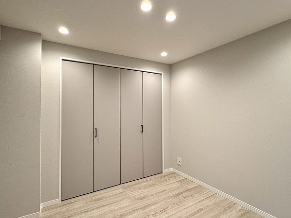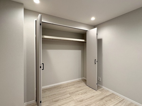 約5.5帖の洋室は開き戸で仕切られているため、就寝時やワークタイムには空間をきちんと分けることができます。壁一面に設けられたワイドクローゼットが収納力を支え、家具を最小限に抑えたレイアウトも実現可能。ベッドルームとしてはもちろん、書斎や趣味部屋としてのアレンジも楽しめそうです。