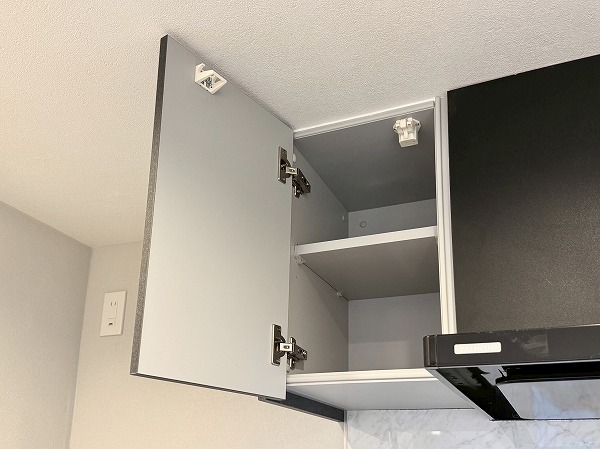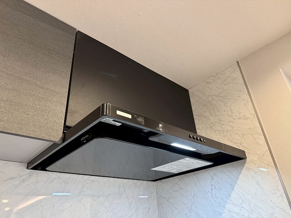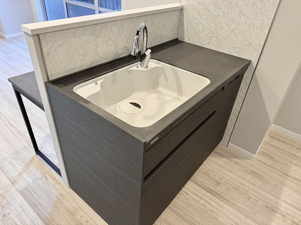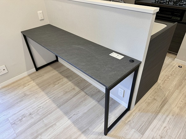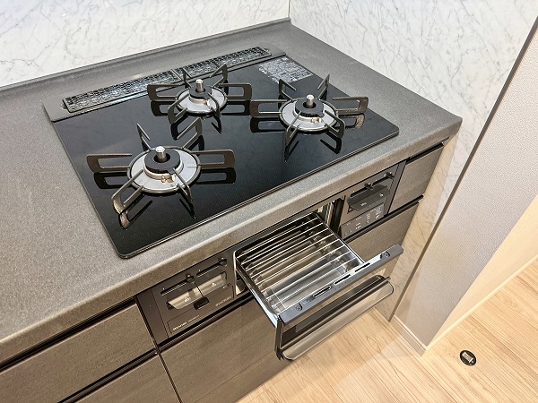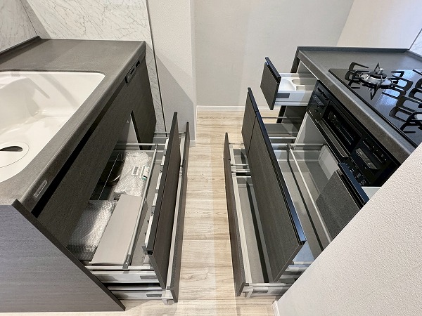 キッチンスペースはⅡ型キッチンをチョイス。コンロは壁付けとすることで調理に集中でき、シンク側はリビングダイニングへ視線が抜ける、開放感のあるレイアウトです。ホワイトベースの明るい室内に、ブラックカラーのキッチンを配し、コントラストの効いた印象に。
