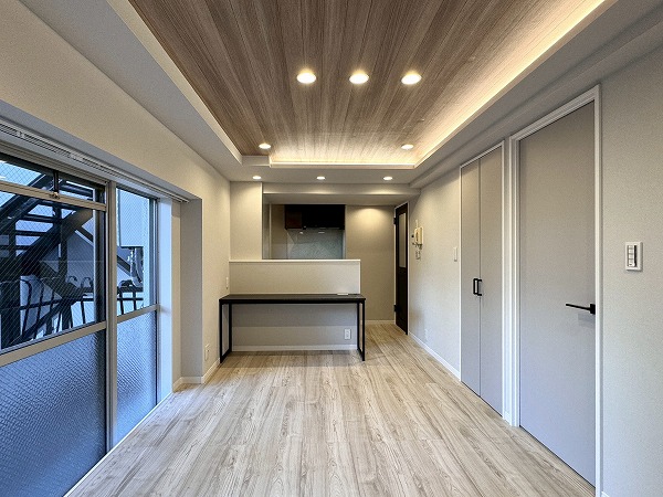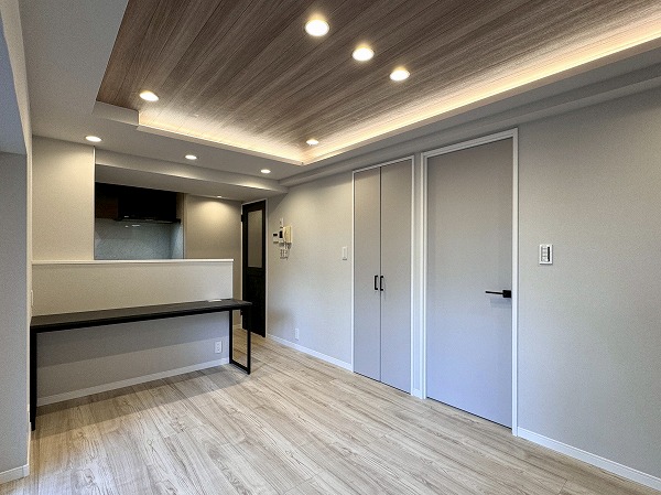 約11.5帖のリビングダイニングキッチンは、暮らしの中心にふさわしい開放的な空間。北・西に窓を配した角住戸のため、時間帯によって変わる光や空の表情をさりげなくお楽しみいただけます☀天井に施された木目のアクセントが、空間全体にやわらかなニュアンスをプラス。
